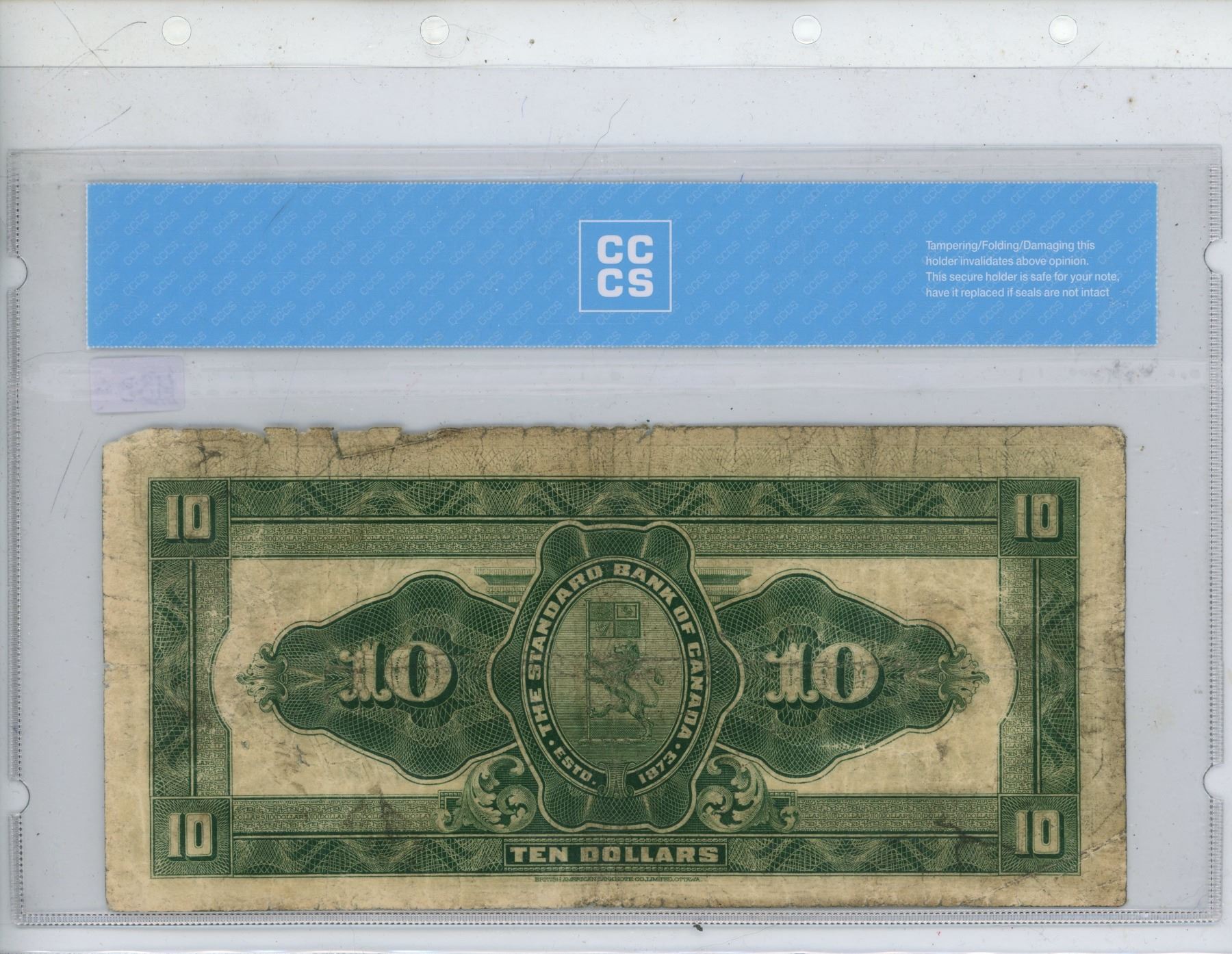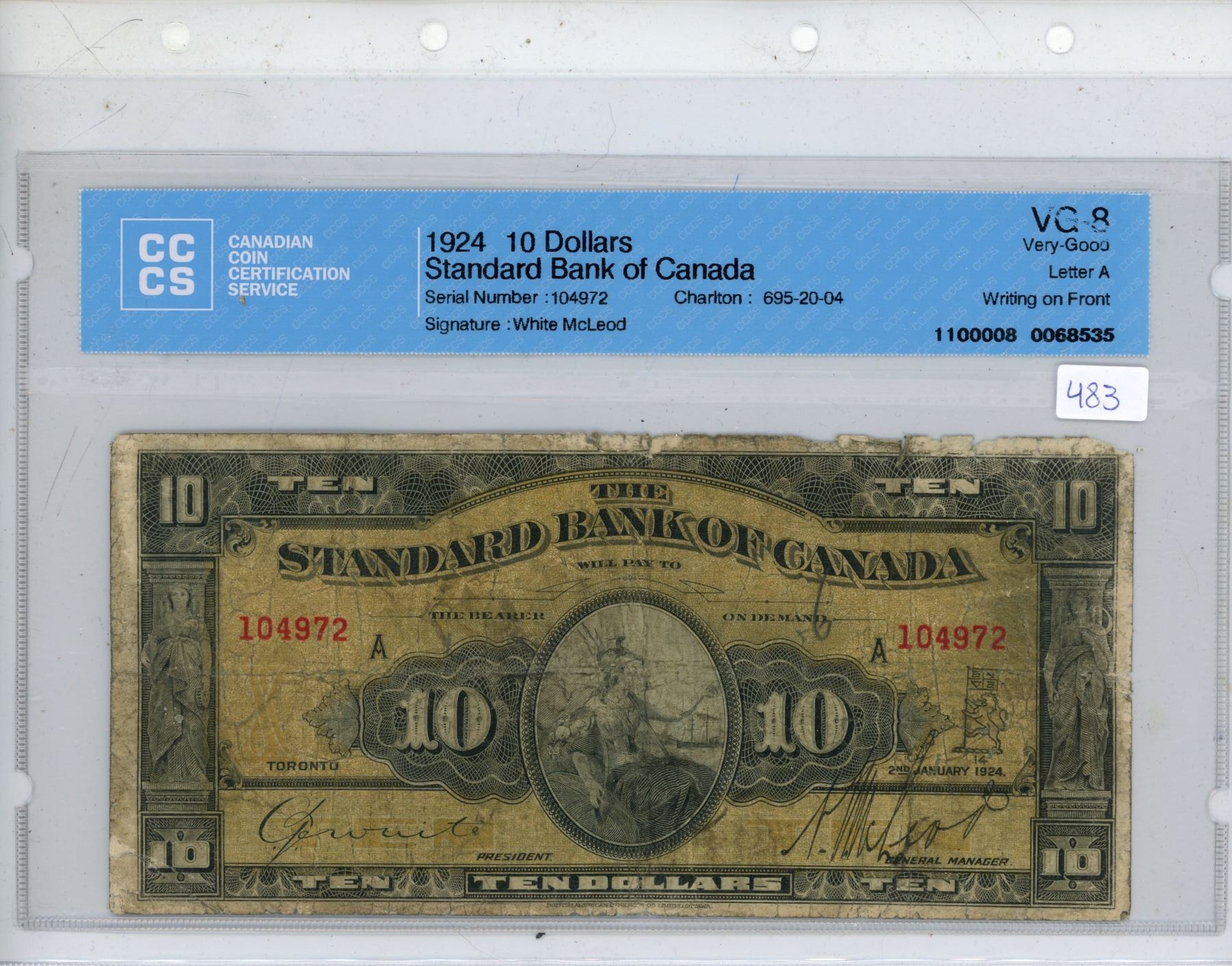 1924 CCCS Graded Standard Bank of Canada 10 Dollar Bill, White/McLeod, 104 VG-8