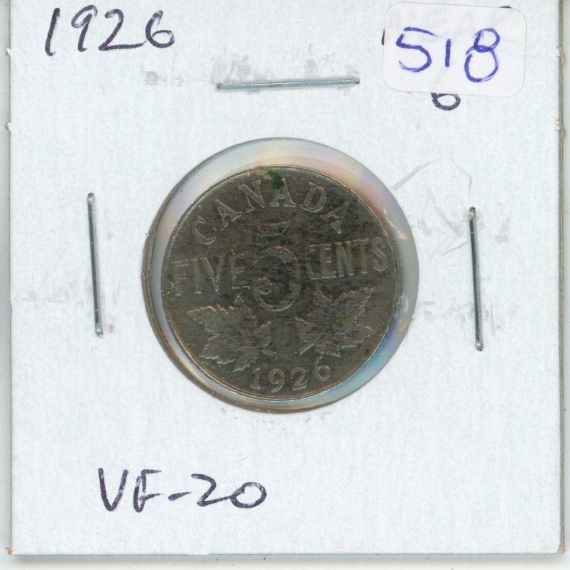 1926 Near 6 Canadian Nickel 5 Cents. VF-20.