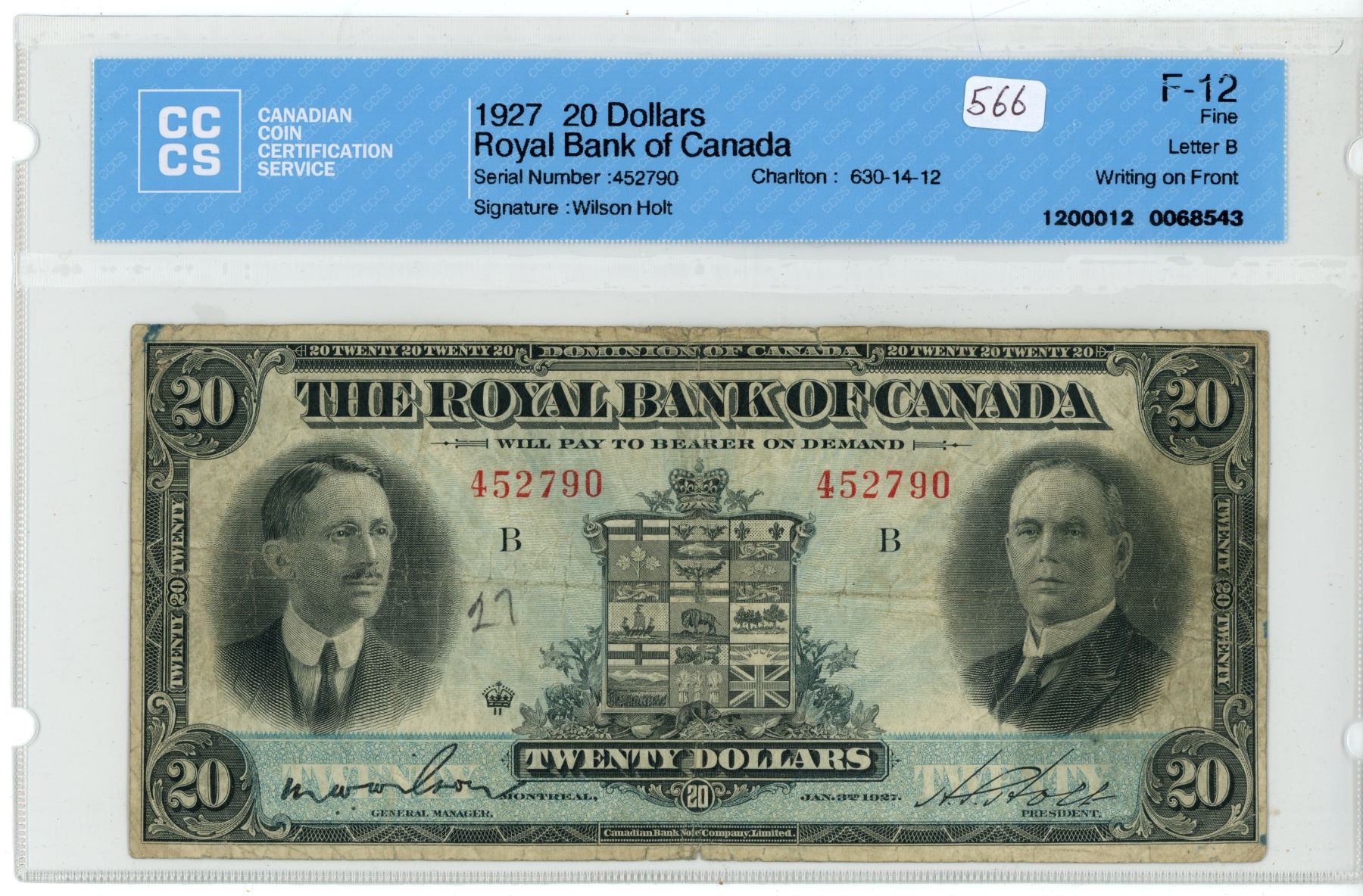 1927 CCCS Graded, "Royal Bank of Canada" Canadian 20 dollar bill - 452790 - F12