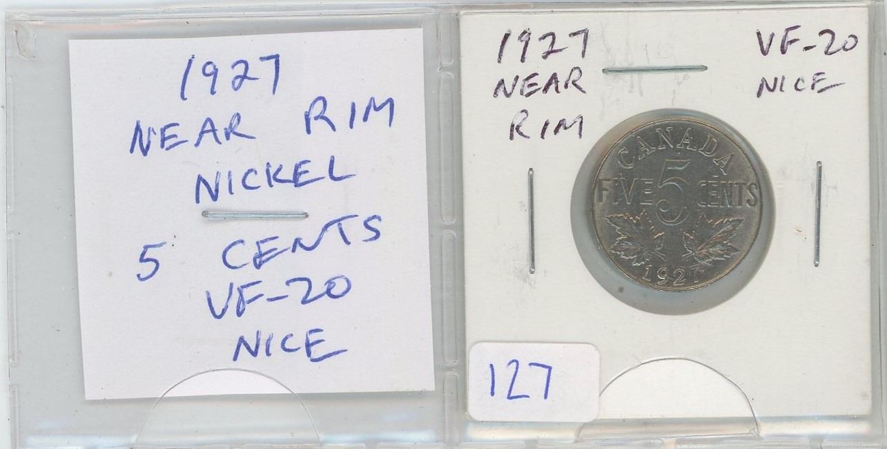 1927 Near Rim Nickel 5 Cents. (S is near Rim). VF-20. Nice.
