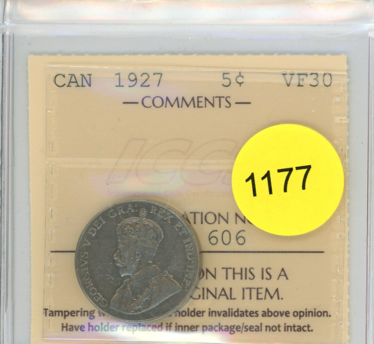 1927 VF30 ICCS Graded Canadian Five Cent Coin