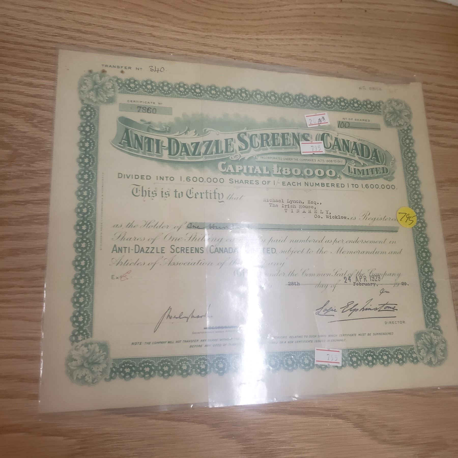 1928 100 shares Anti Dazzle Screens of Canada
