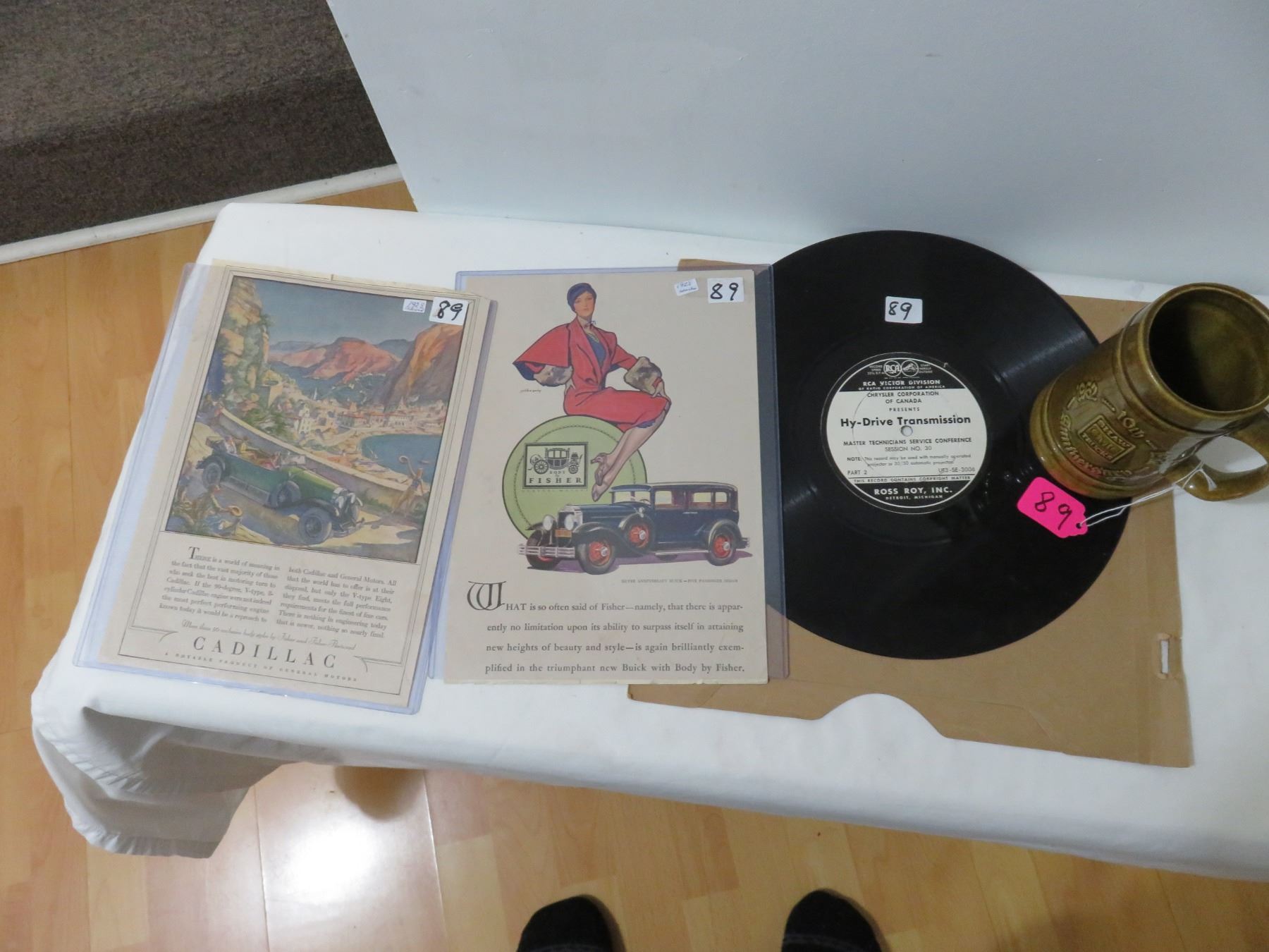 1928 Cadillac And 1928 Buick Car Paper Advertisement, Chrysler Tech 33 Record, Sunburst Medalta Mug, GMC Shaw Truck Anniversary