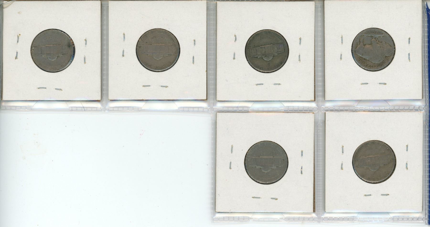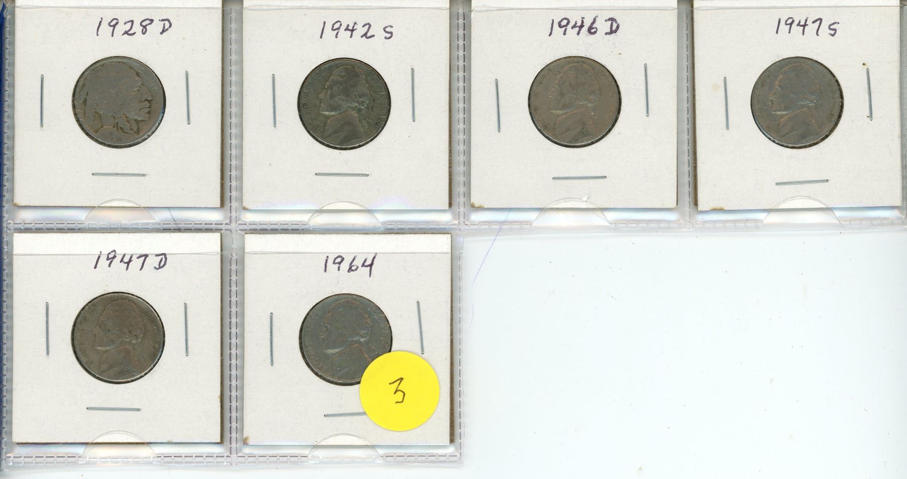 1928d, 1942s. 1946d, 1947s, 1947d 1964 U S.A. Five Cent Coins