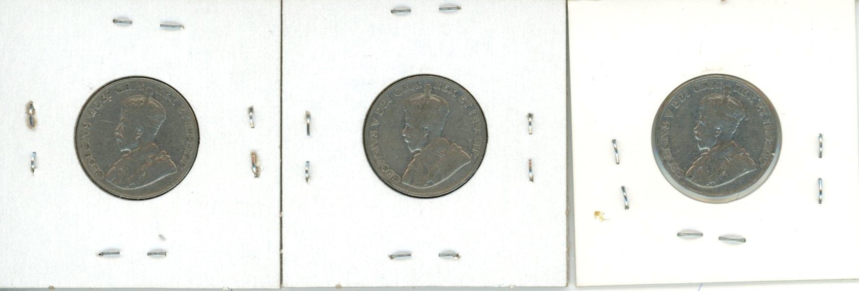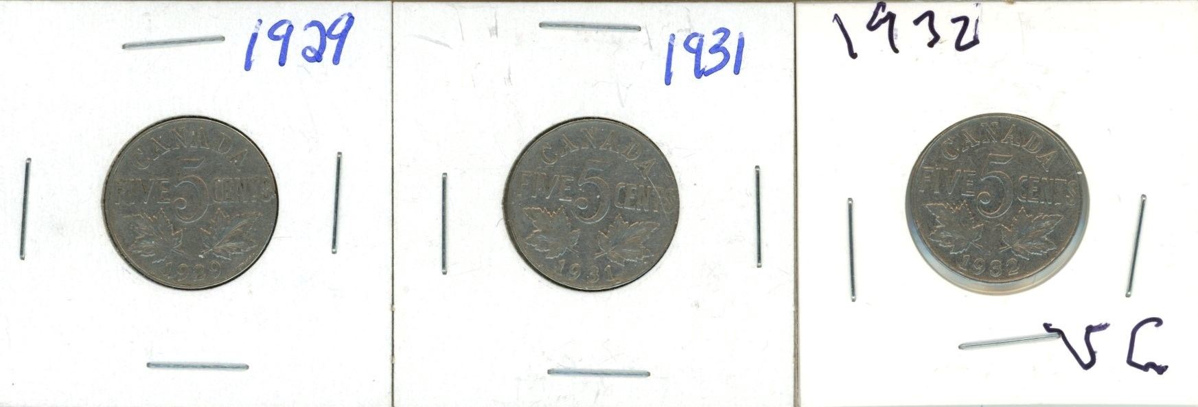 1929, 1931, 1932 Canadian 5 Cent Coins - 3 Piece