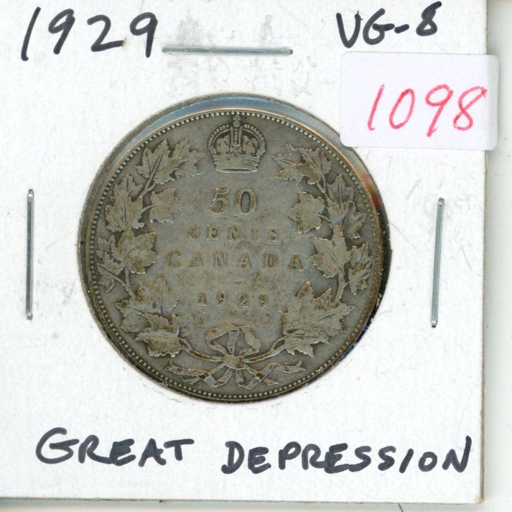 1929 Canadian Silver 50 Cents. Key Date. Mintage of 206,398. Great Depression coin. VG-8.