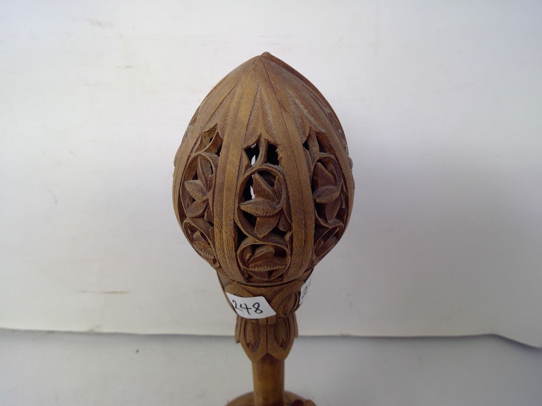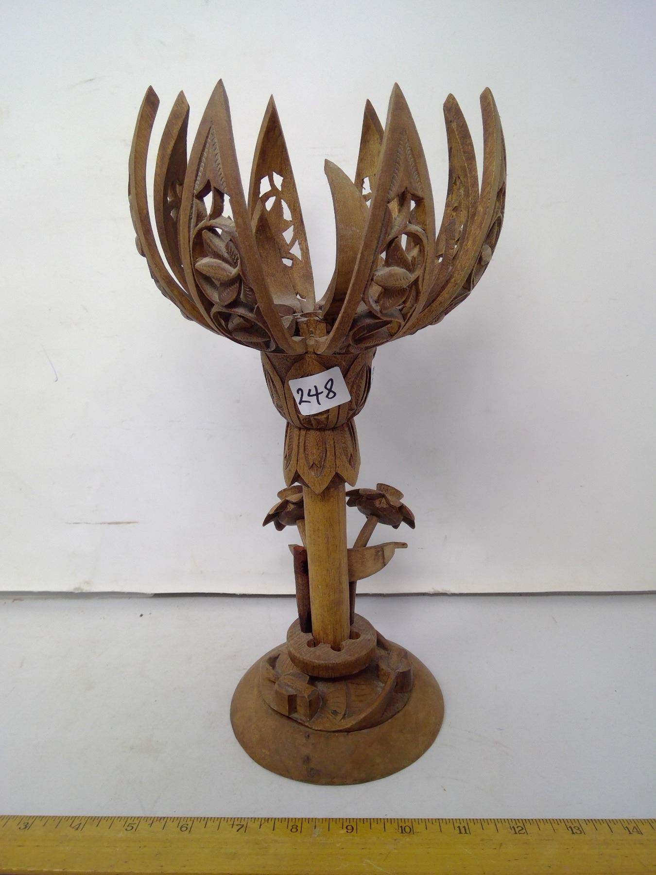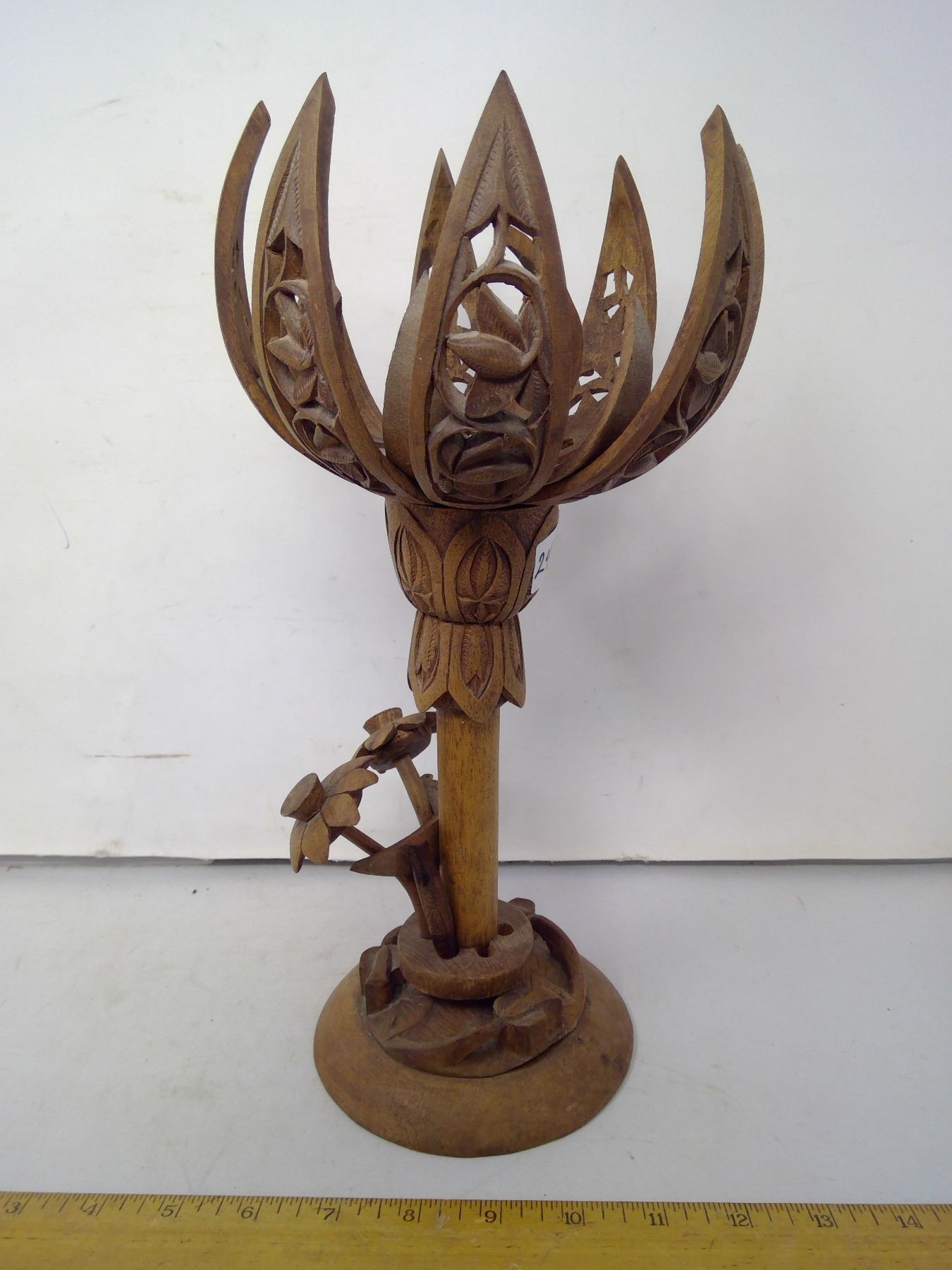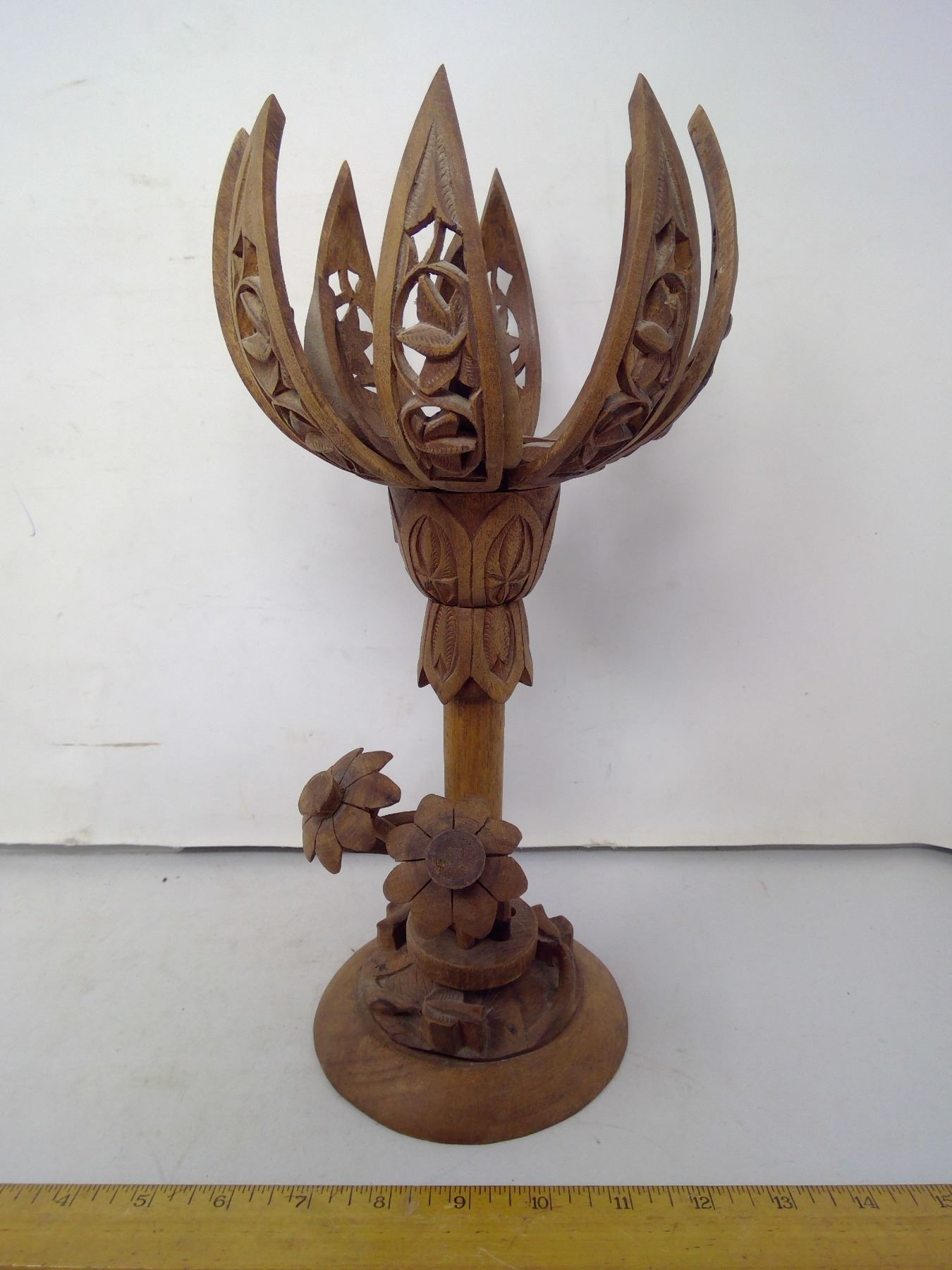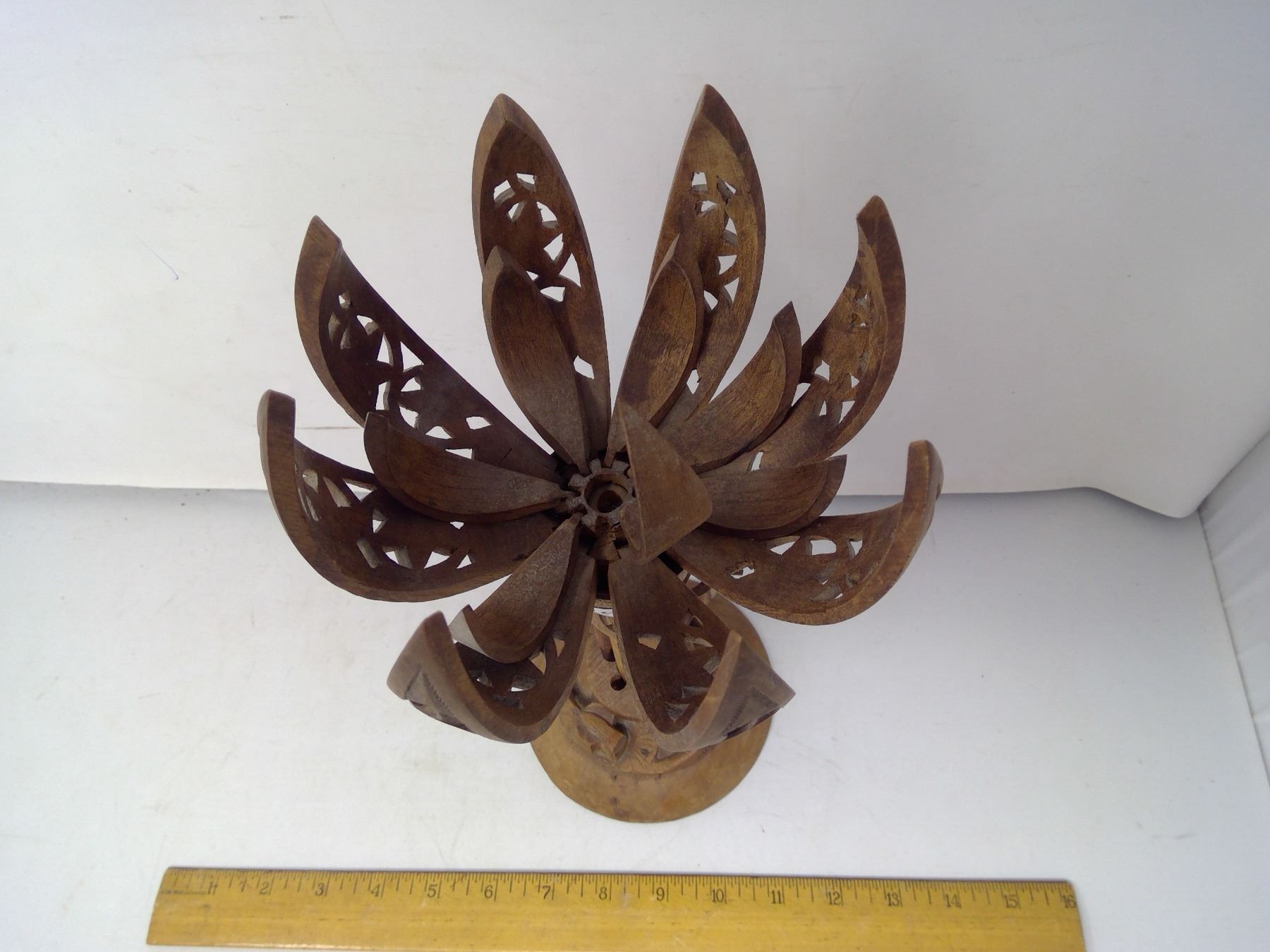 1930 Central Europe Mechanical Flower Wood Carving 8 Petals Open - Height 13"