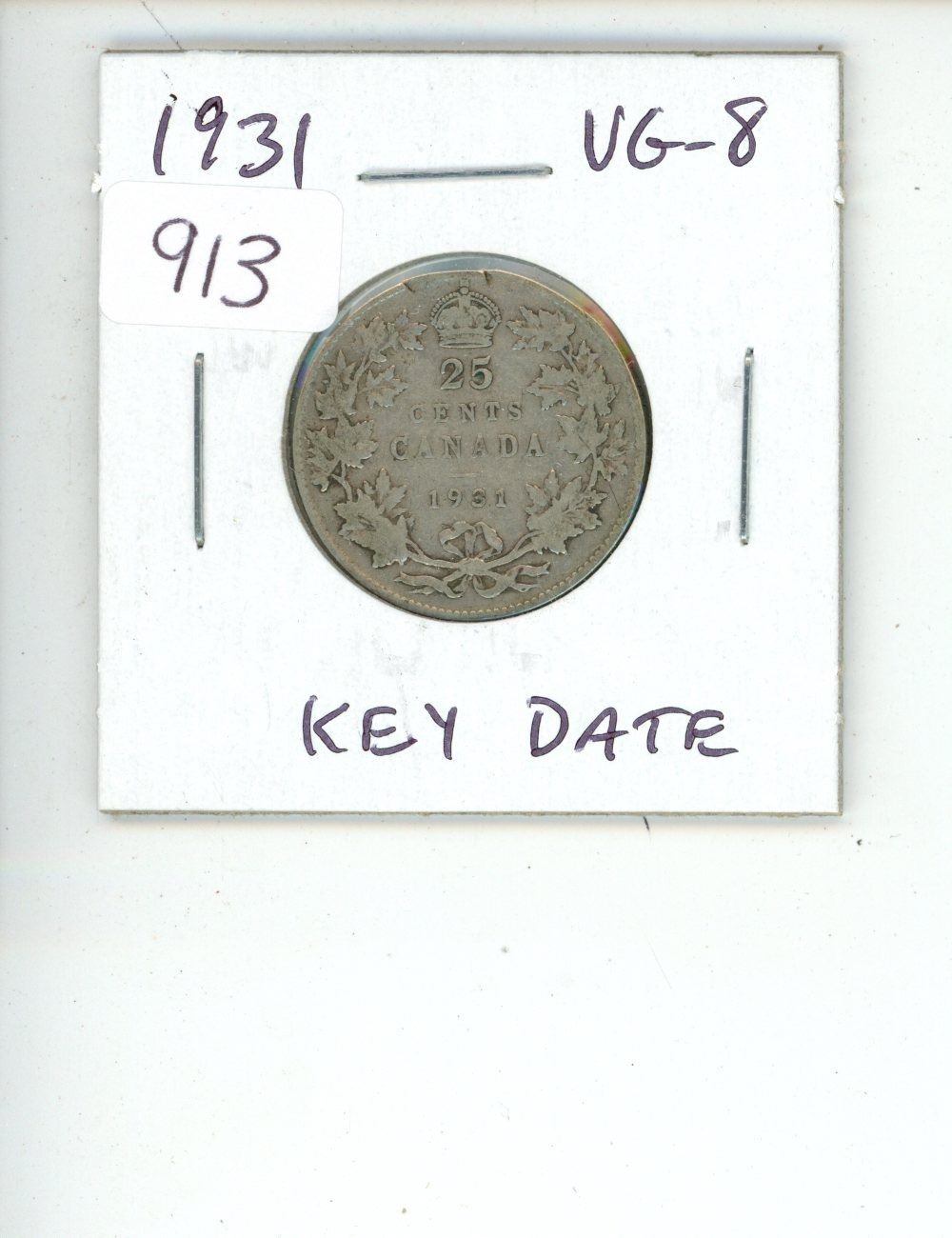1931 Canadian George V Silver 25 Cents. Key Date. Mintage of 537,815. VG-8.