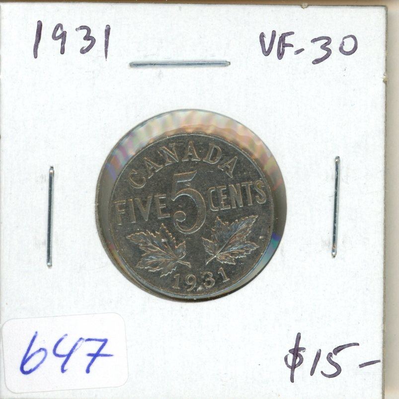 1931 Canadian Nickel 5 Cents. VF-30. Nice.
