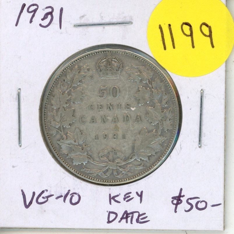 1931 Canadian Silver 50 Cents. Key Date. Mintage of 57,581. VG-10.