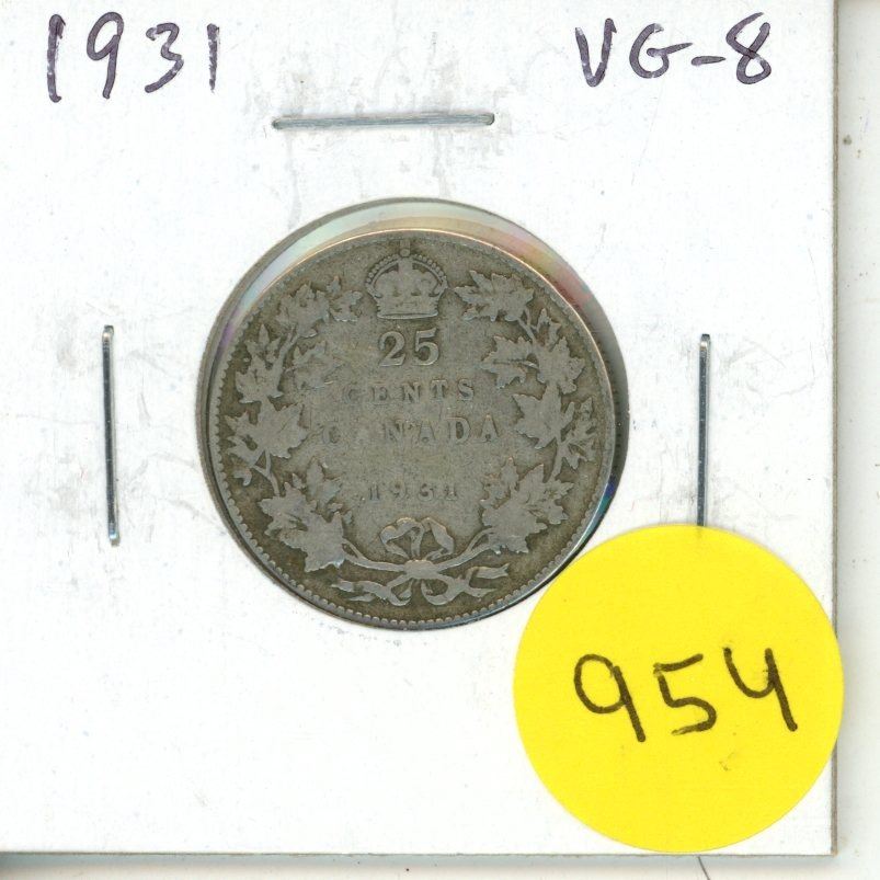 1931 Silver 25 Cents. Key Date. Mintage of 537,815. VG-8.