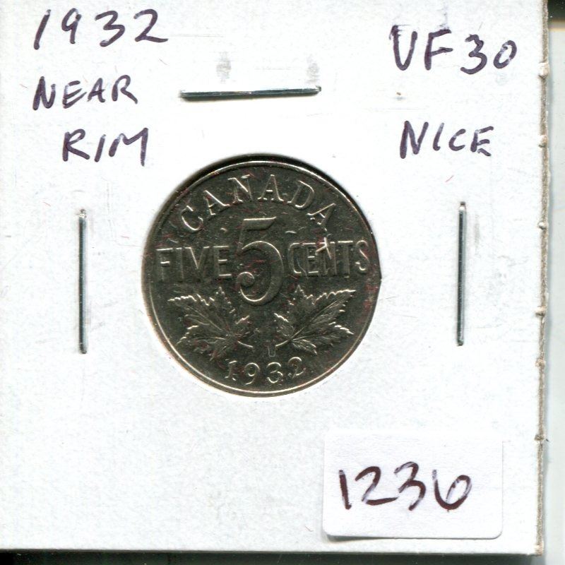 1932 Near Rim Canadian Nickel 5 Cents. S is Near Rim. VF-30- Nice.