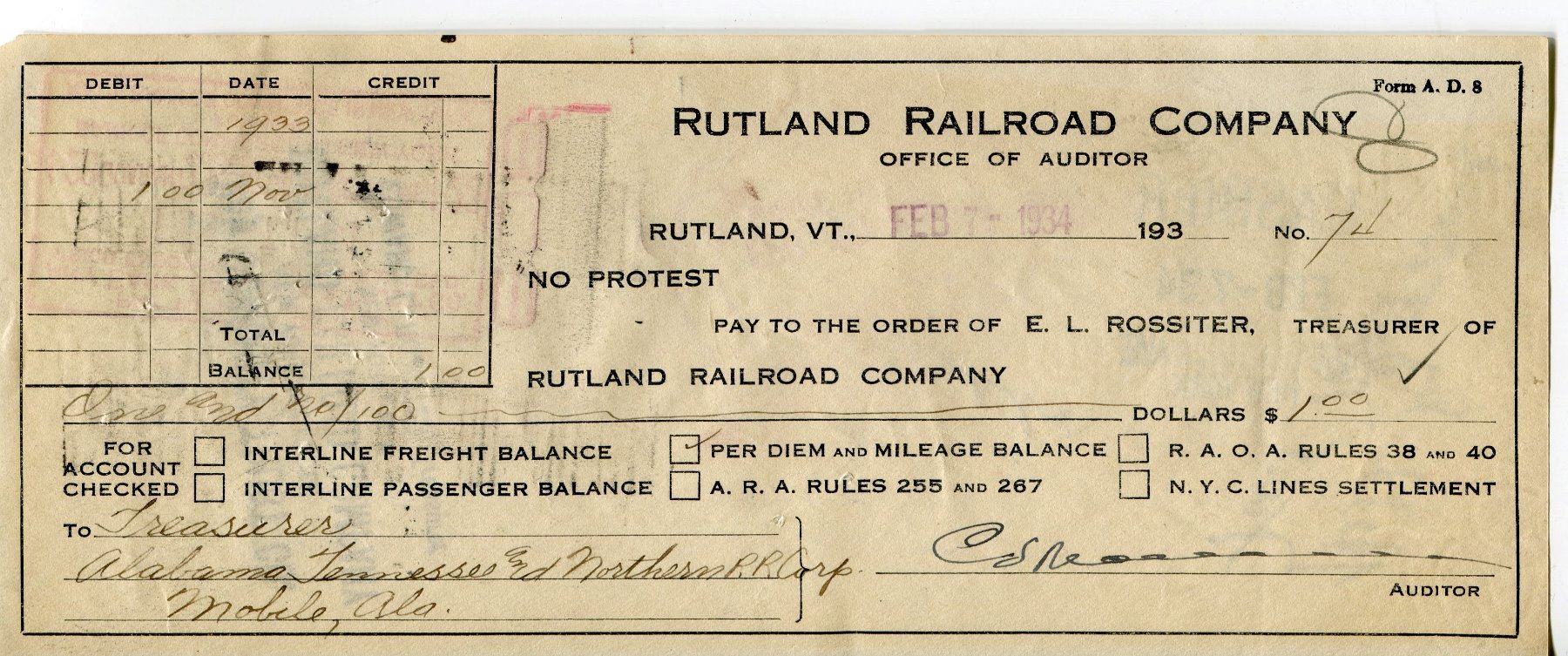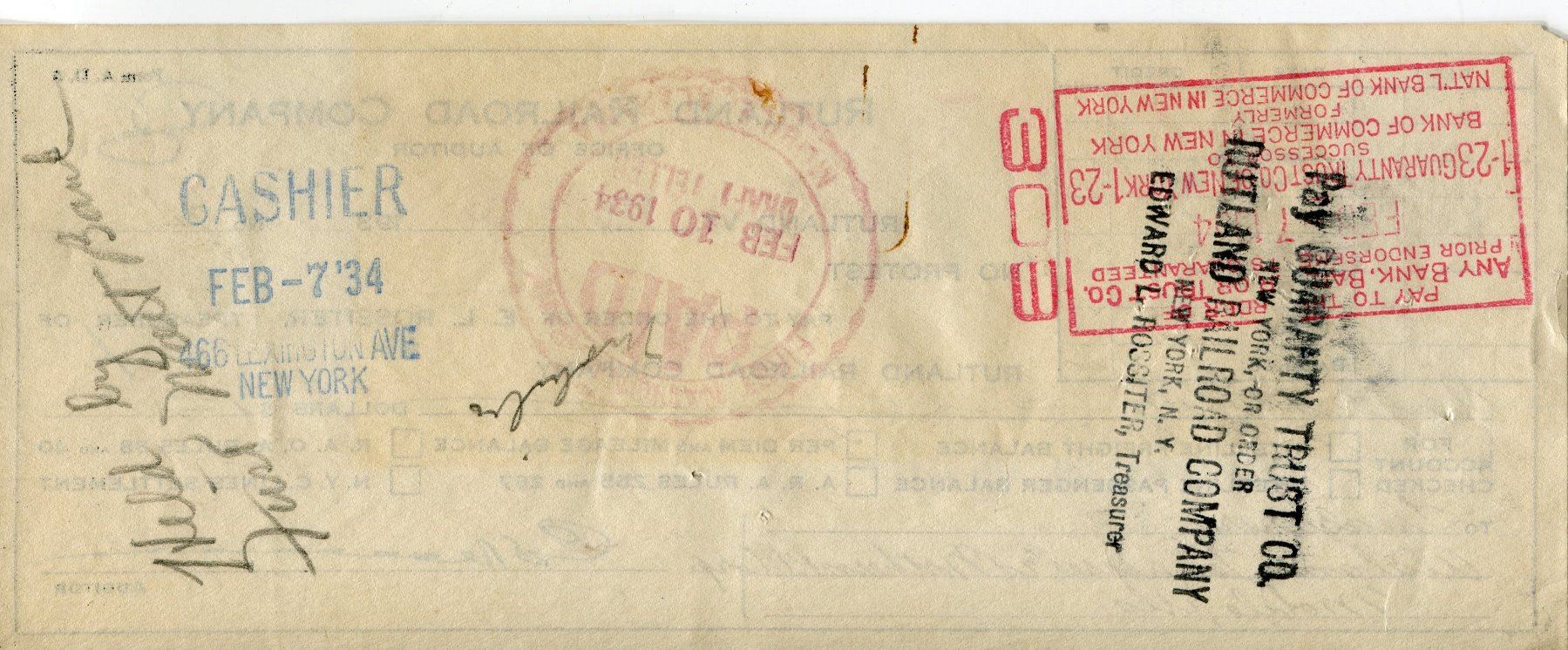 1934 CHEQUE (RUTLAND RAILROAD, CO., RUTLAND VT.) *PAYMENT OF $1,000*