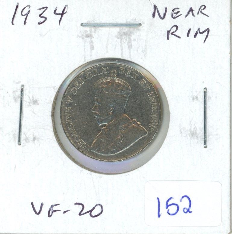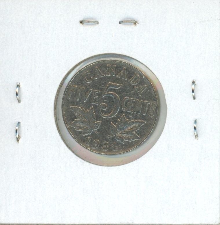 1934 Canadian Nickel 5 Cents. Near Rim variety. (S is Near the Rim). VF-20.