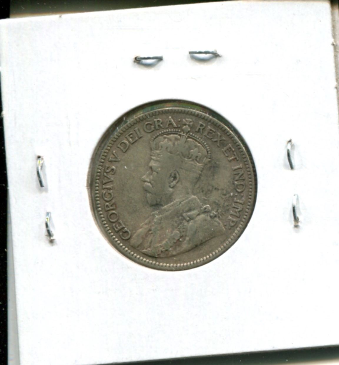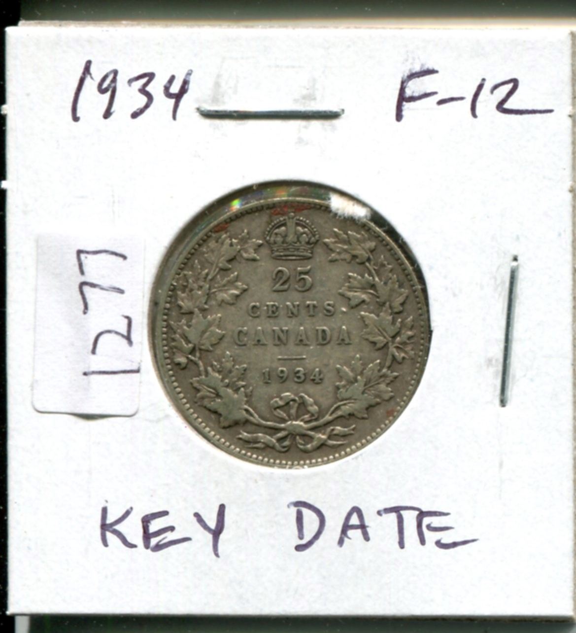 1934 Canadian Silver 25 Cents. Key Date. Mintage of 384,350. F-12.