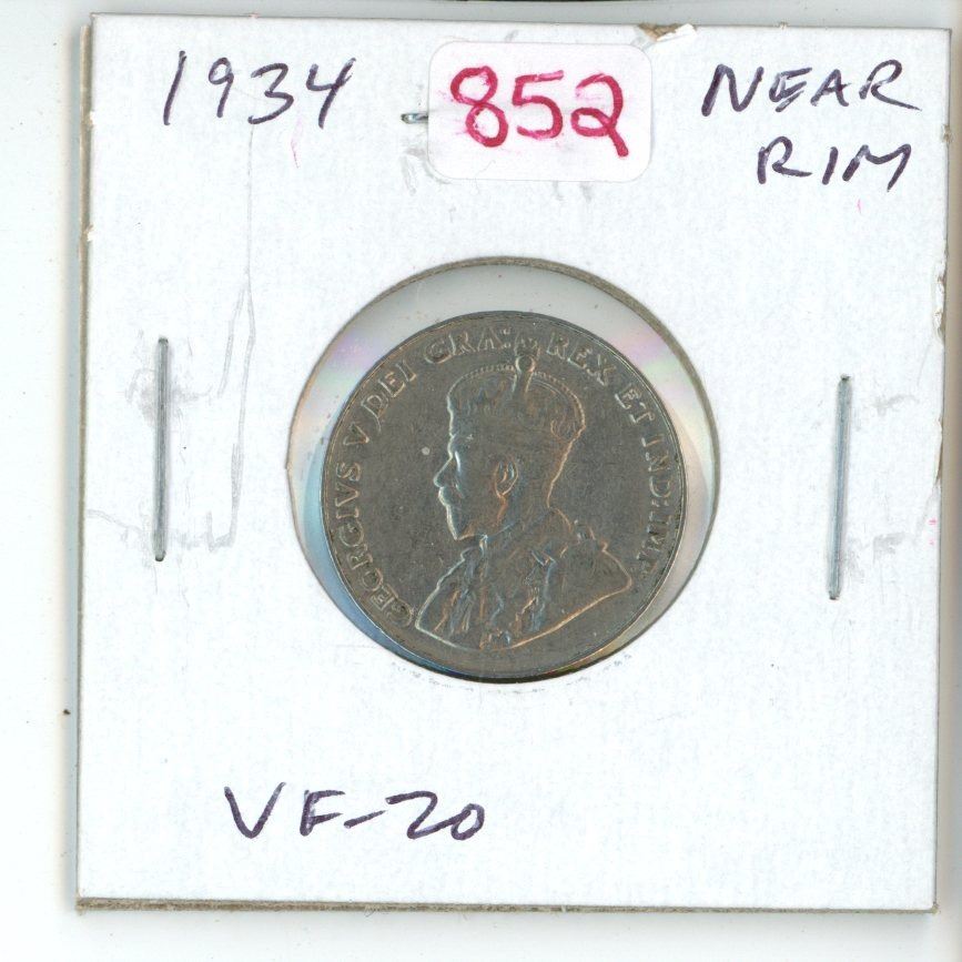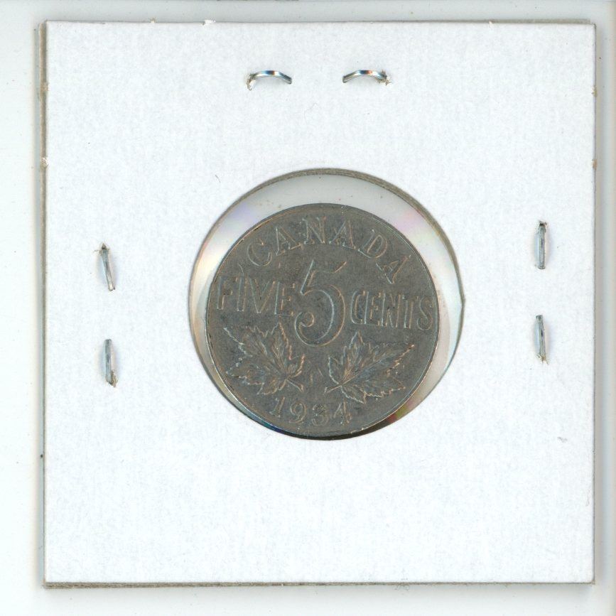 1934 Near Rim Canadian Nickel 5 Cents. S in CENTS is Near the Rim. VF-20.