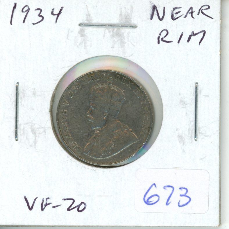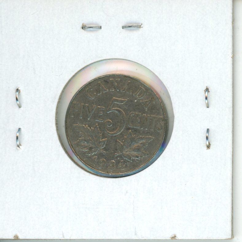 1934 Near Rim Canadian Nickel 5 Cents. S is Near the Rim. VF-20.