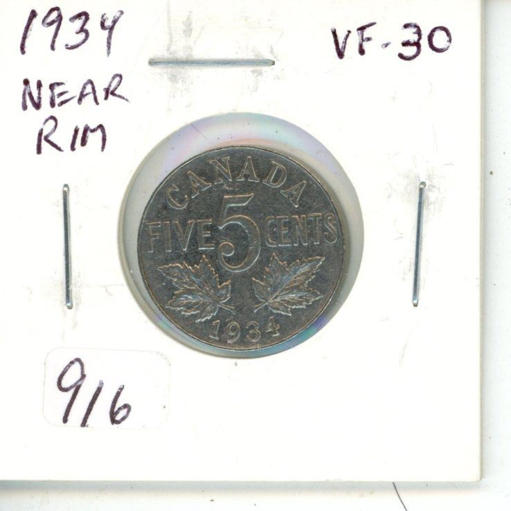 1934 Near Rim Nickel 5 Cents. S is Near Rim. VF-30.