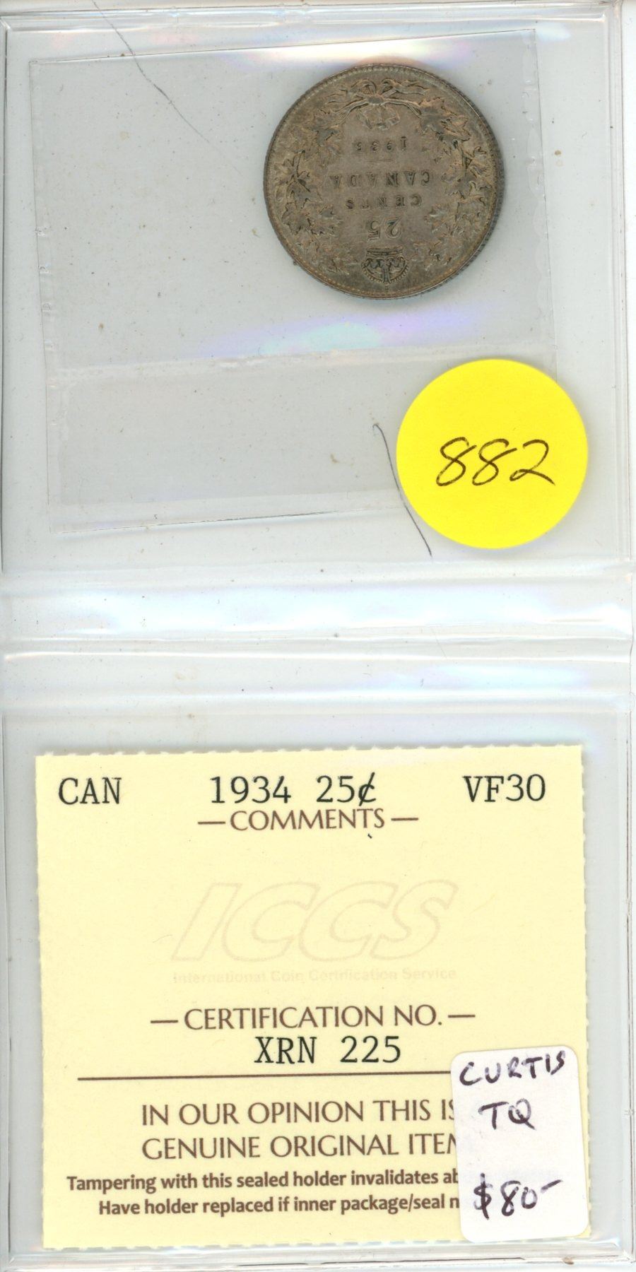 1934 Silver 25 Cents. ICCS certified and graded VF-30.