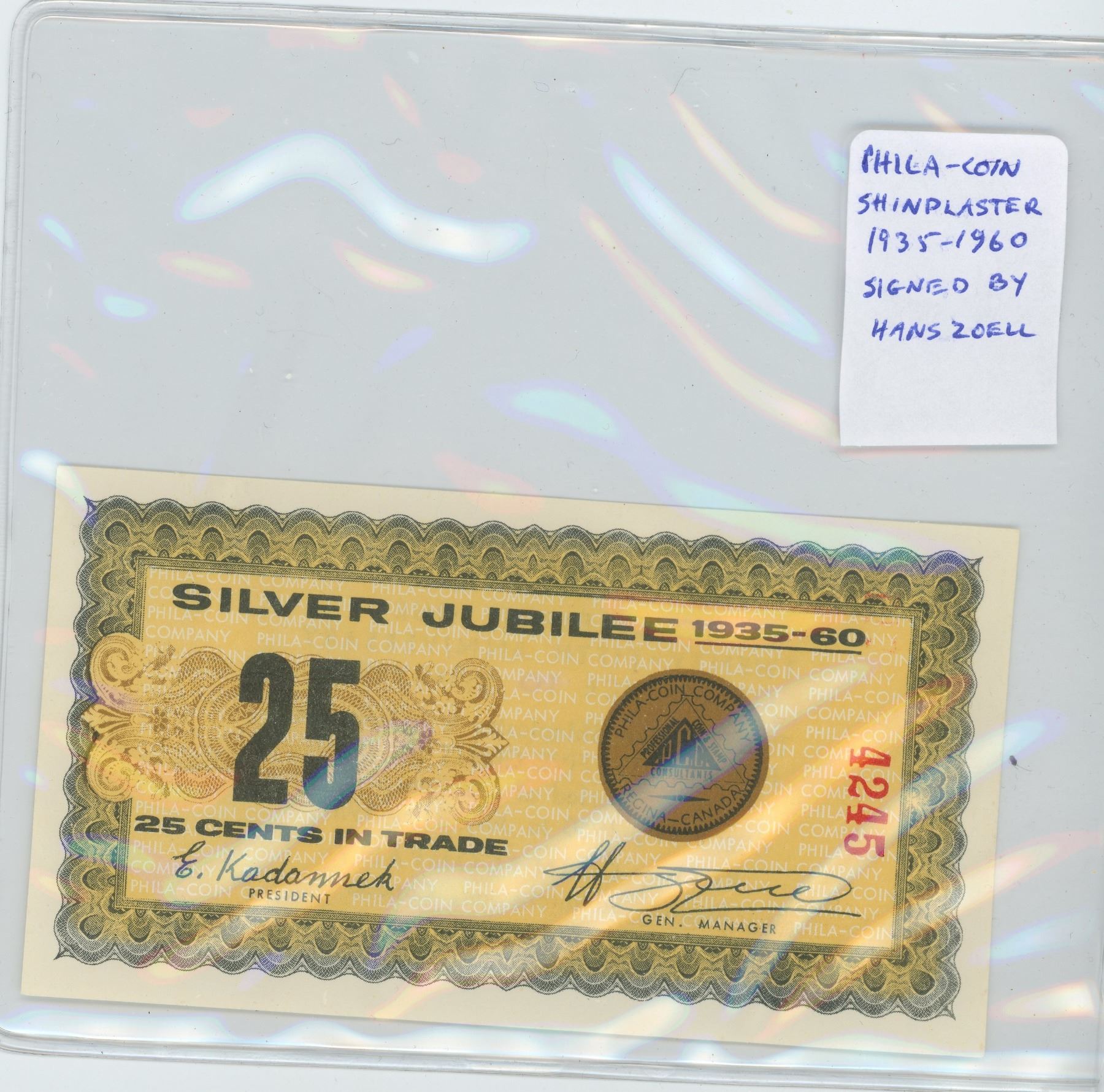 1935-1960 25 CENTS SHINPLASTER CELEBRATING THE SILVER JUBILEE OF FAMED COIN AND STAMP DEALER HANS ZOELL, OWNER OF PHILA-COIN IN REGINA. UNCIRCULATED.