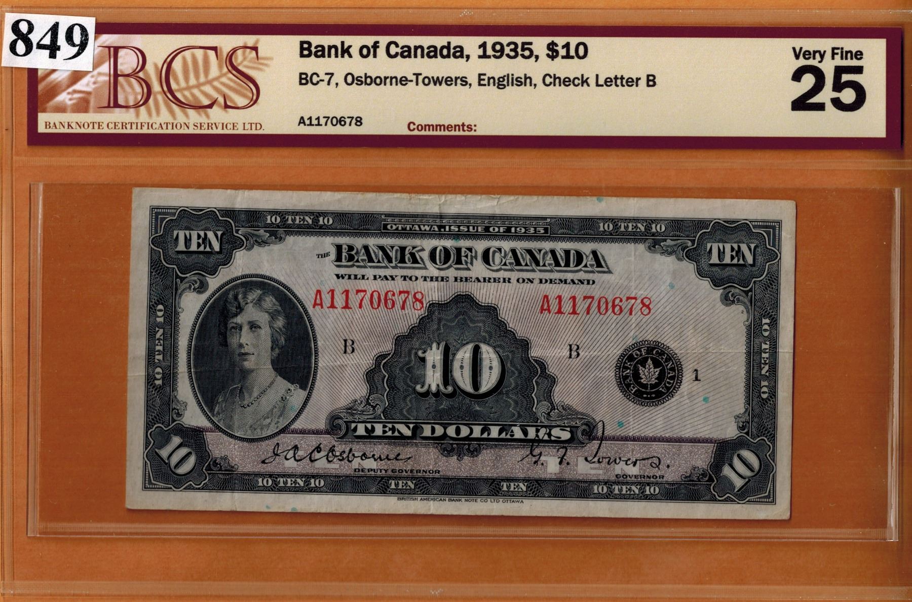 1935 BANK OF CANADA $10.00 BANKNOTE - BCS GRADED - VERY FINE 25