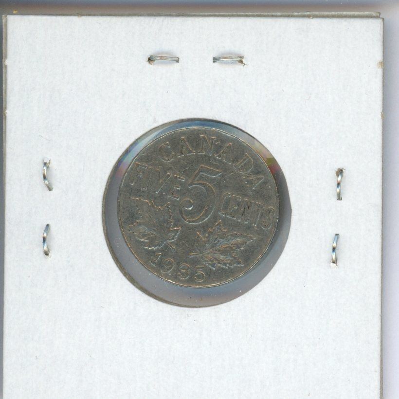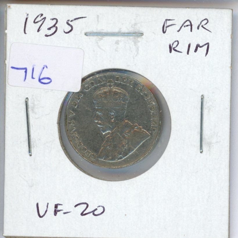 1935 Far Rim George V Nickel 5 Cents. S is Far from Rim. VF-20.