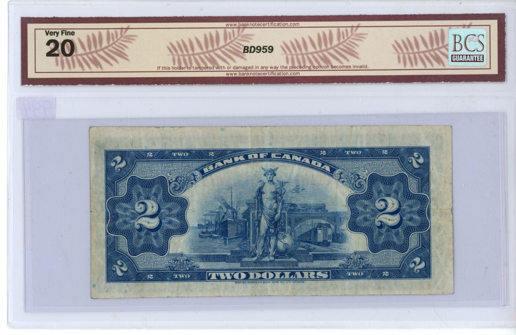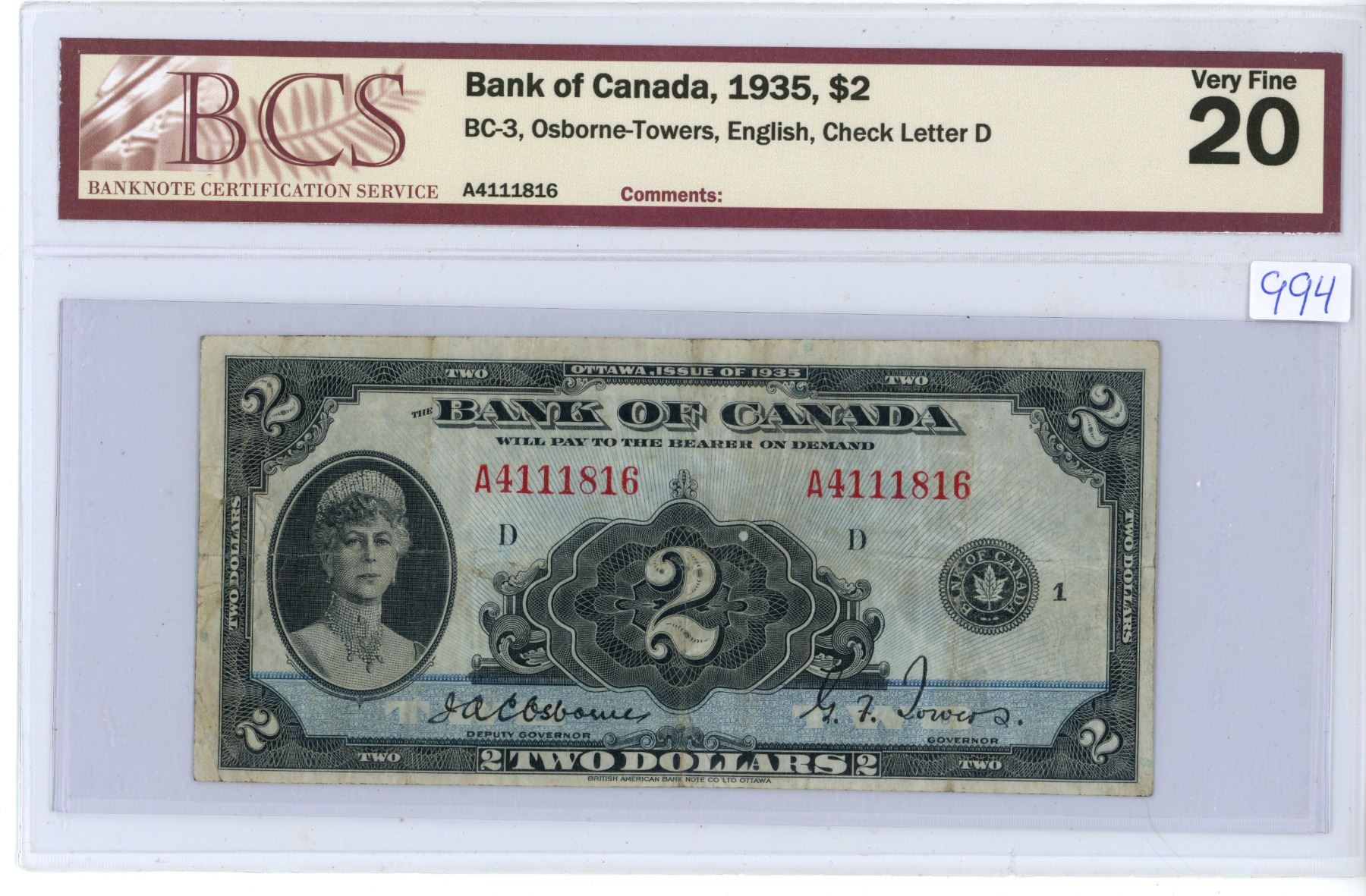 1935 Graded Canadian $2 "Queen Mary" bill - Osborne/Towers - A4111816 - VF20
