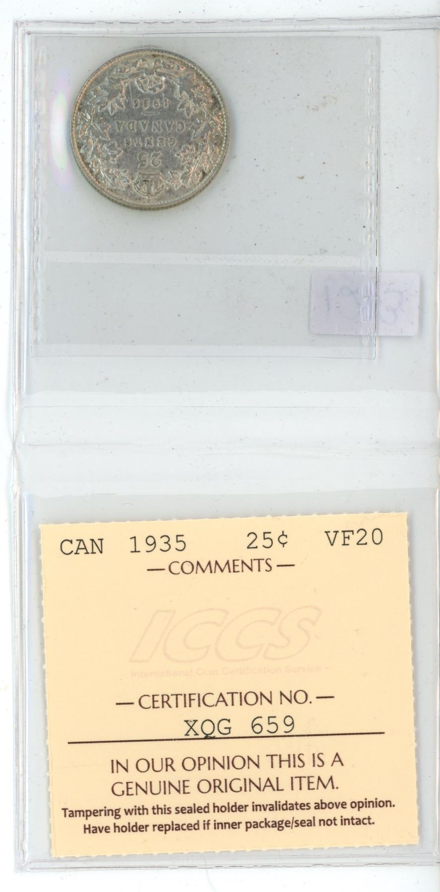 1935 ICCS Graded, Canadian 25 cent silver coin - VF20