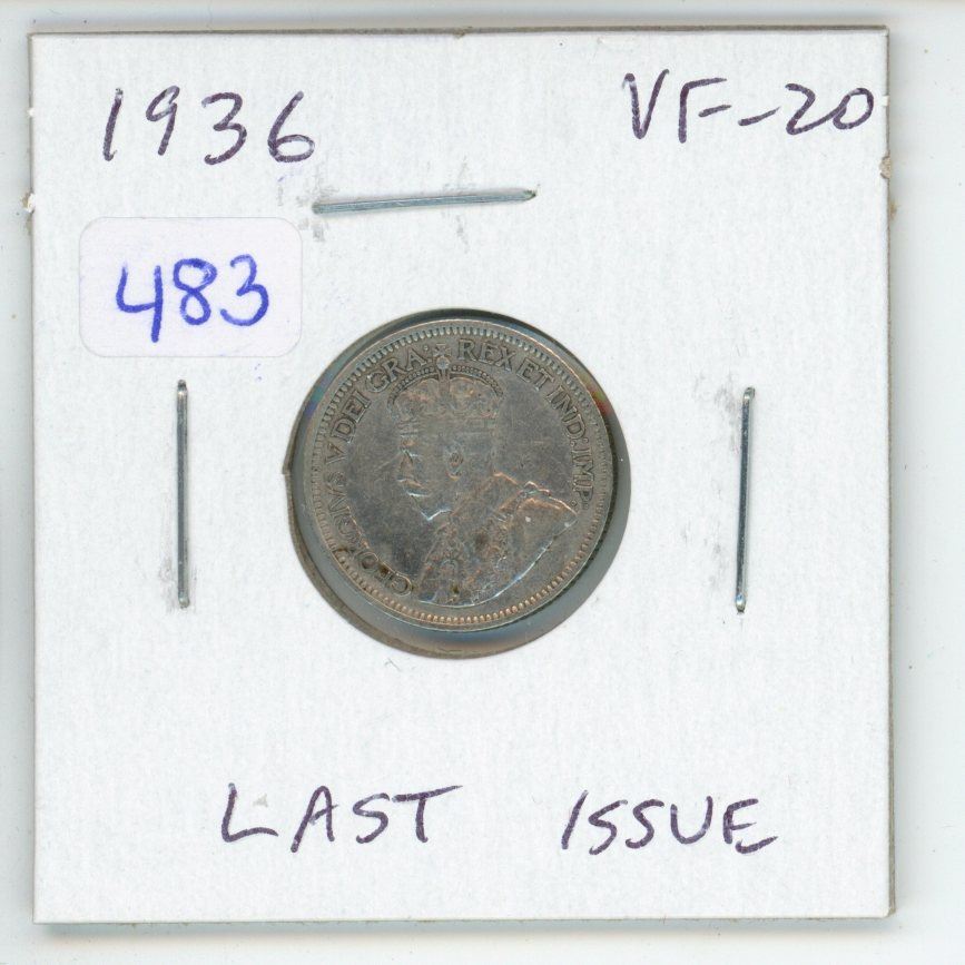 1936 Canadian Silver 10 Cents. Last issue for King George V. VF-20.