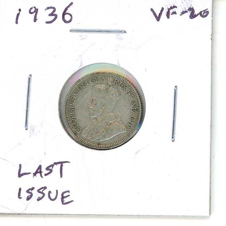 1936 Canadian Silver 10 Cents. Last issue of King George V. VF-20.