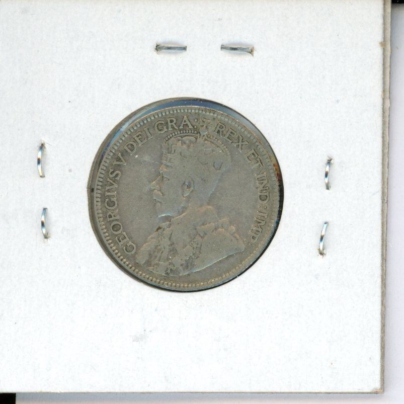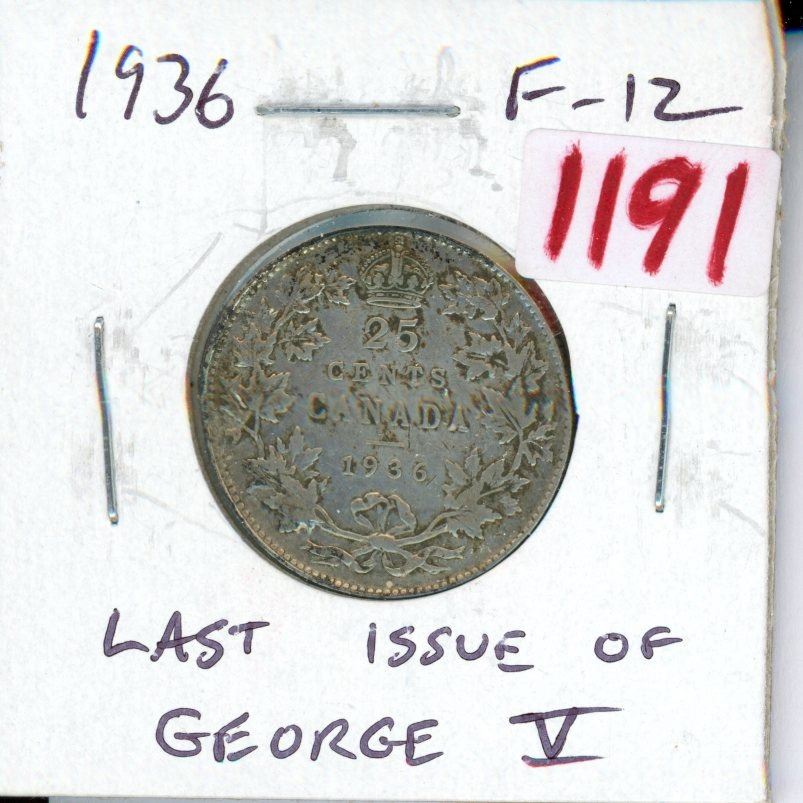 1936 Canadian Silver 25 Cents. Last issue of King George V. F-12.