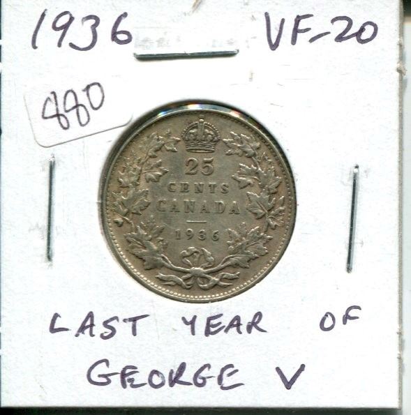 1936 Canadian Silver 25 Cents. The last 25 Cents issued for King George V. VF-20. Nice.