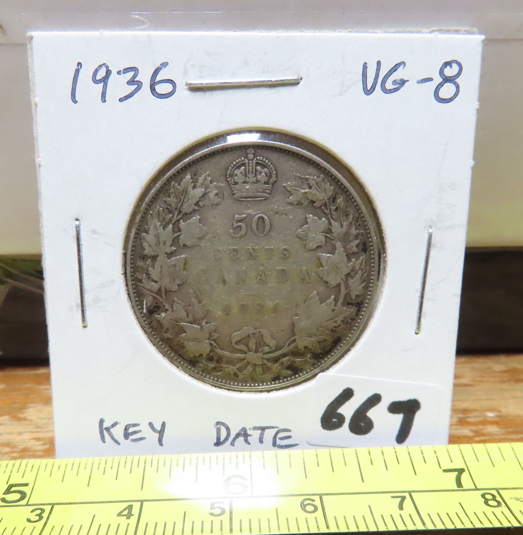 1936 Canadian Silver 50 Cents. Key Date. Mintage of 38,550. VG-8.