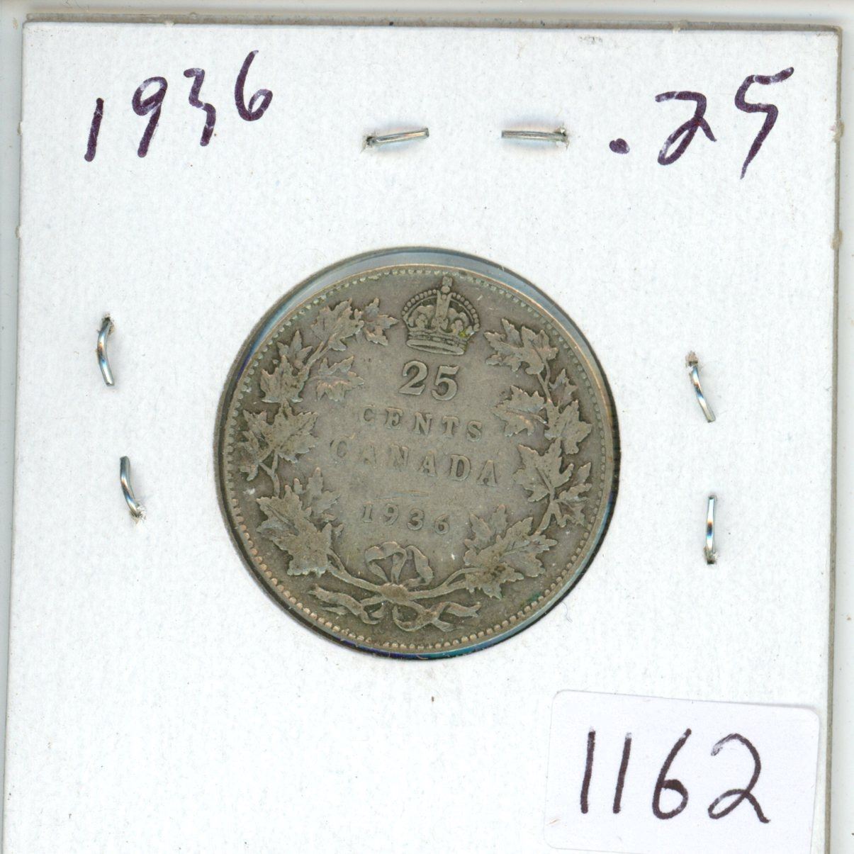 1936 Canadian silver 25 cent coin