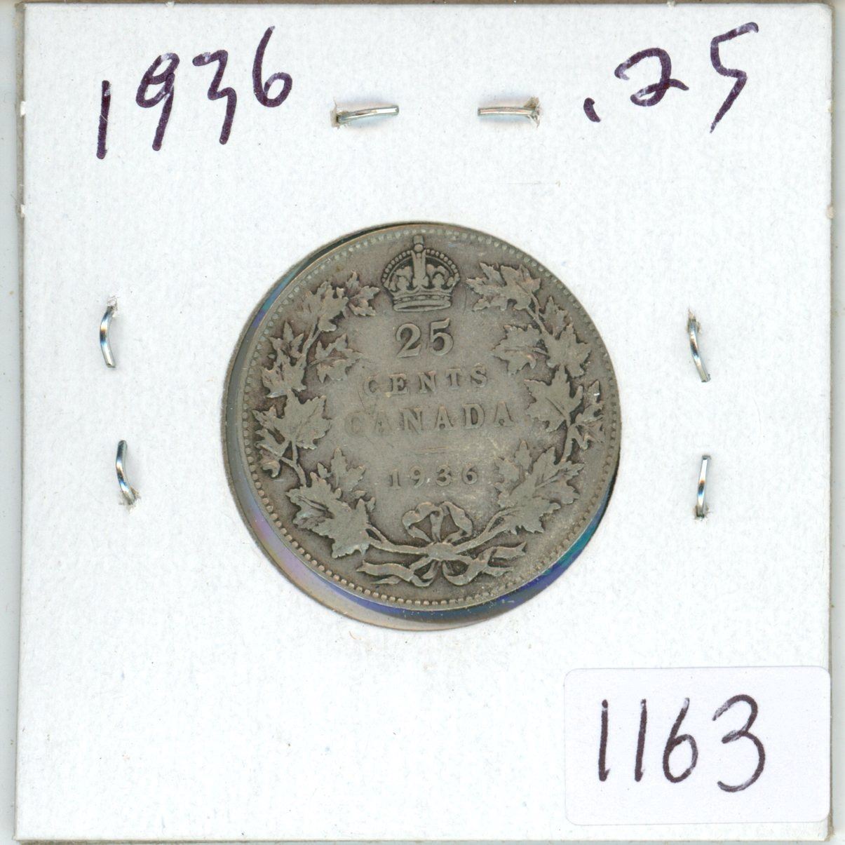 1936 Canadian silver 25 cent coin