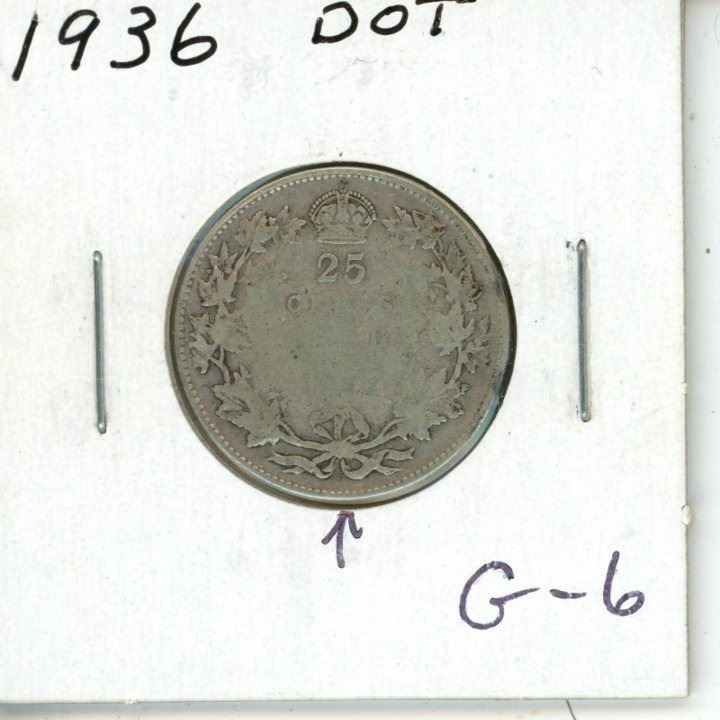 1936 Dot 25 Cents. Key Date. Emergency Issue minted in early 1937 but bearing a Dot under the wreath on the Reverse. G-6.