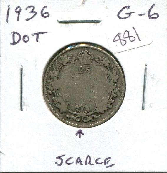 1936 Dot Canadian Silver 25 Cents. Scarce. G-6.