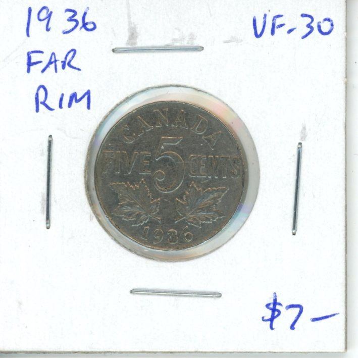 1936 Far Rim Canadian Nickel 5 Cents. S is Far from Rim. VF-30.