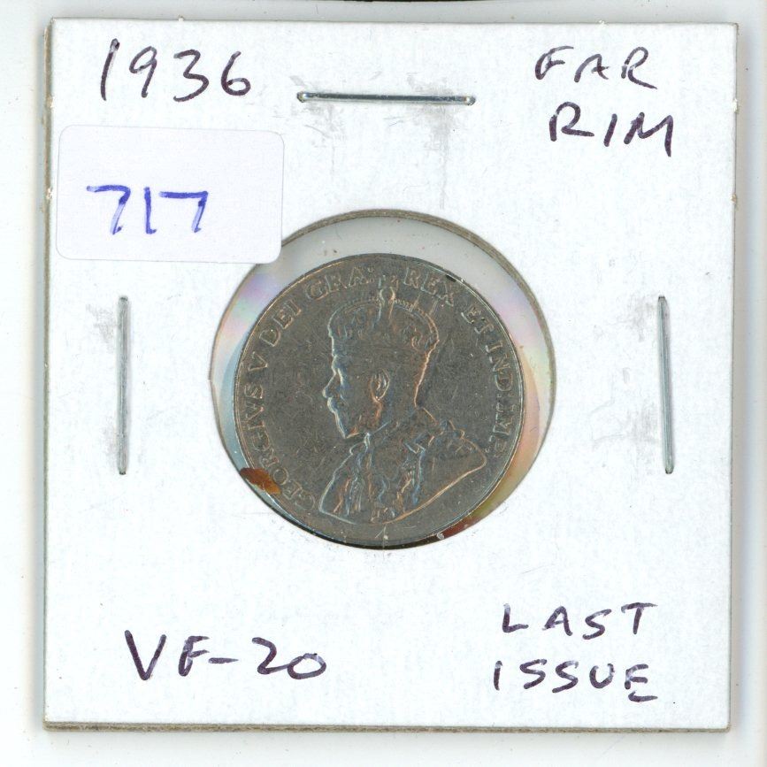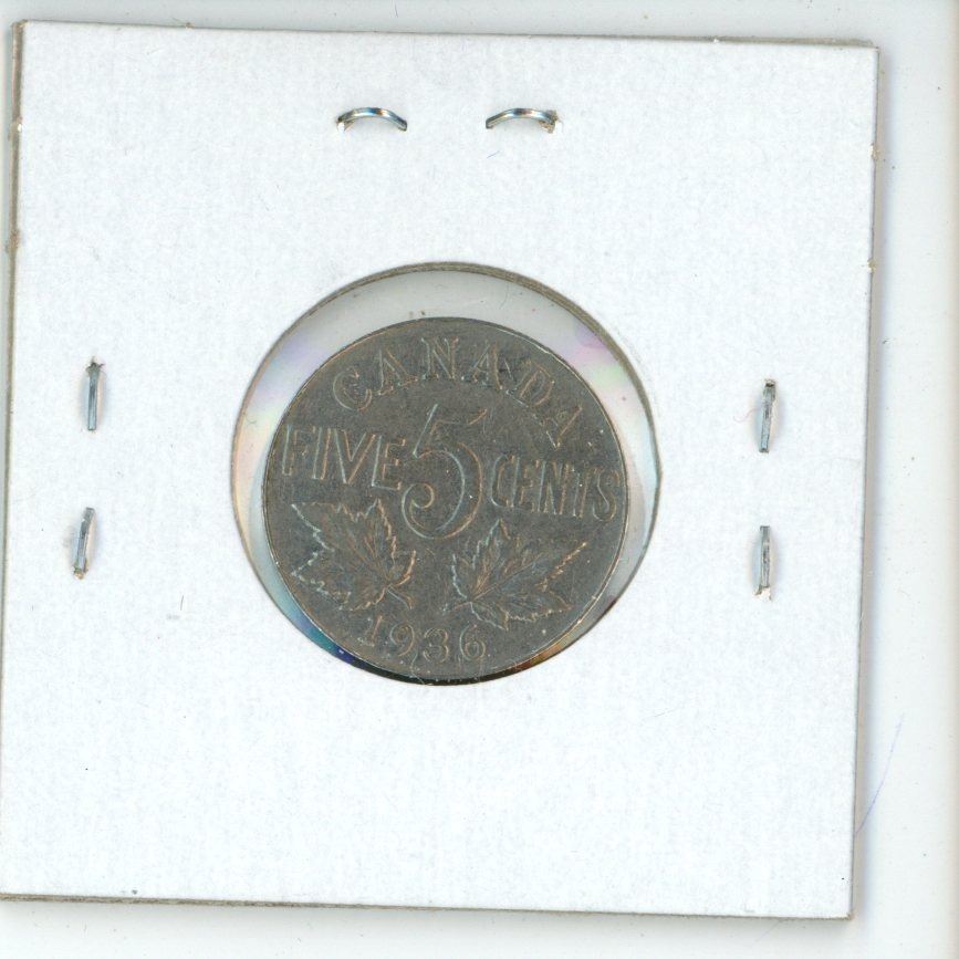 1936 Far Rim George V Nickel 5 Cents. S is Far from Rim. VF-20. Last issue of George V.