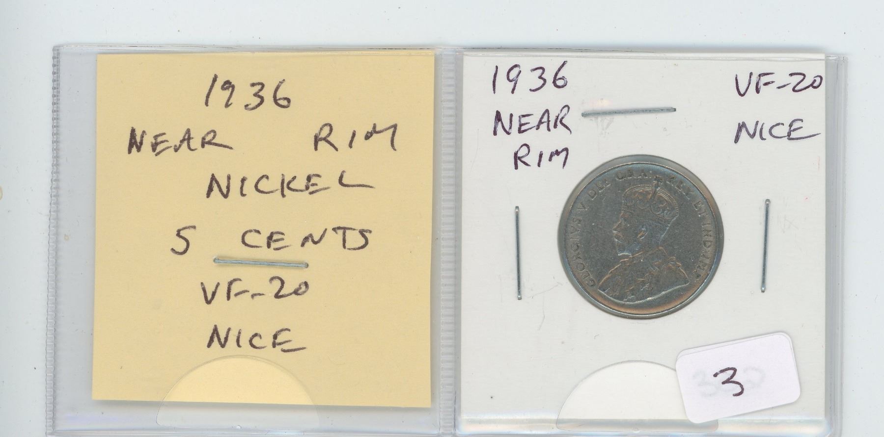 1936 NEAR RIM NICKEL 5 CENTS. VF-20. NICE.