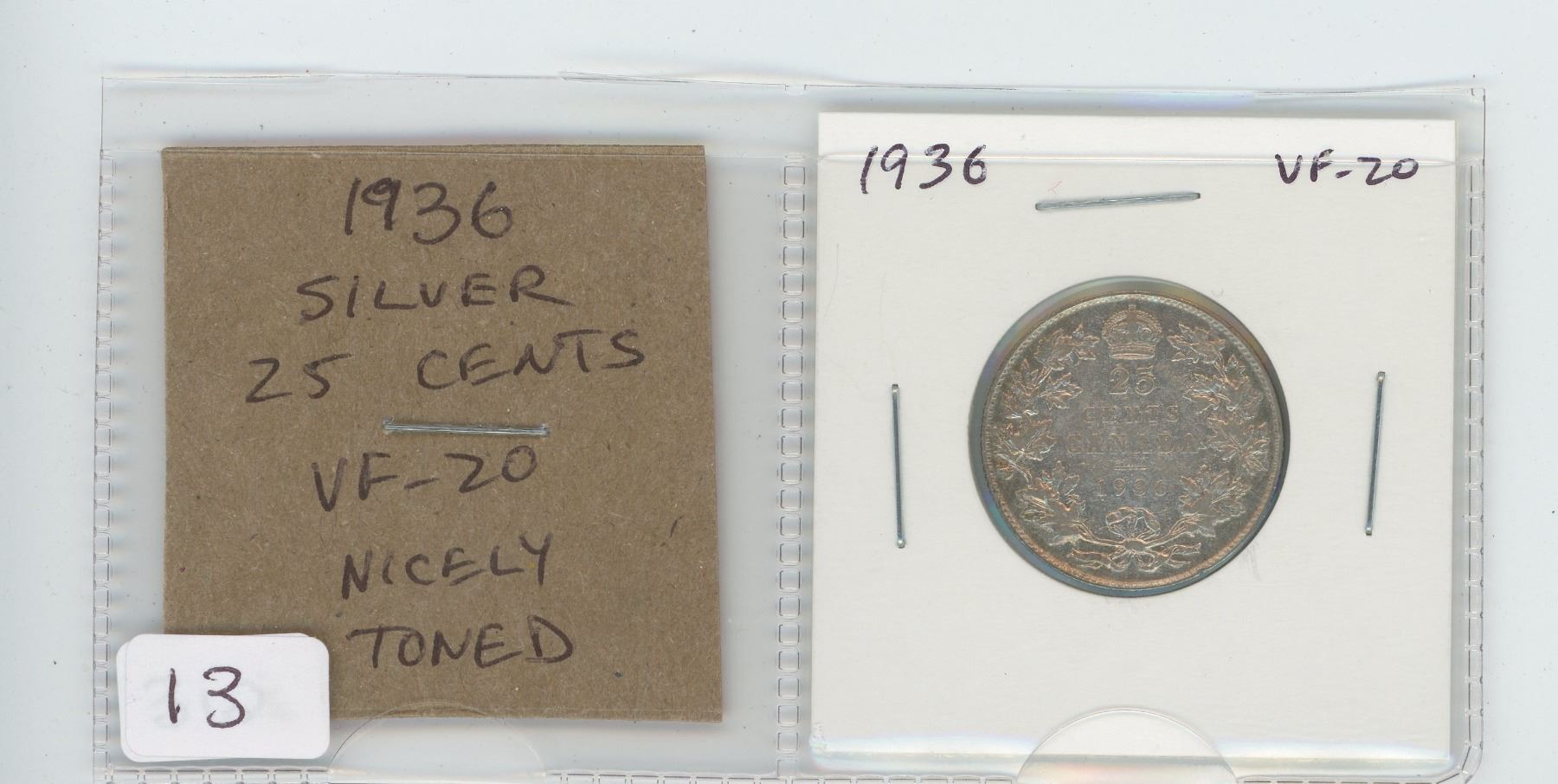 1936 SILVER 25 CENTS. THE LAST SILVER 25 CENTS ISSUED FOR GEORGE V. VF-20. NICELY TONED.