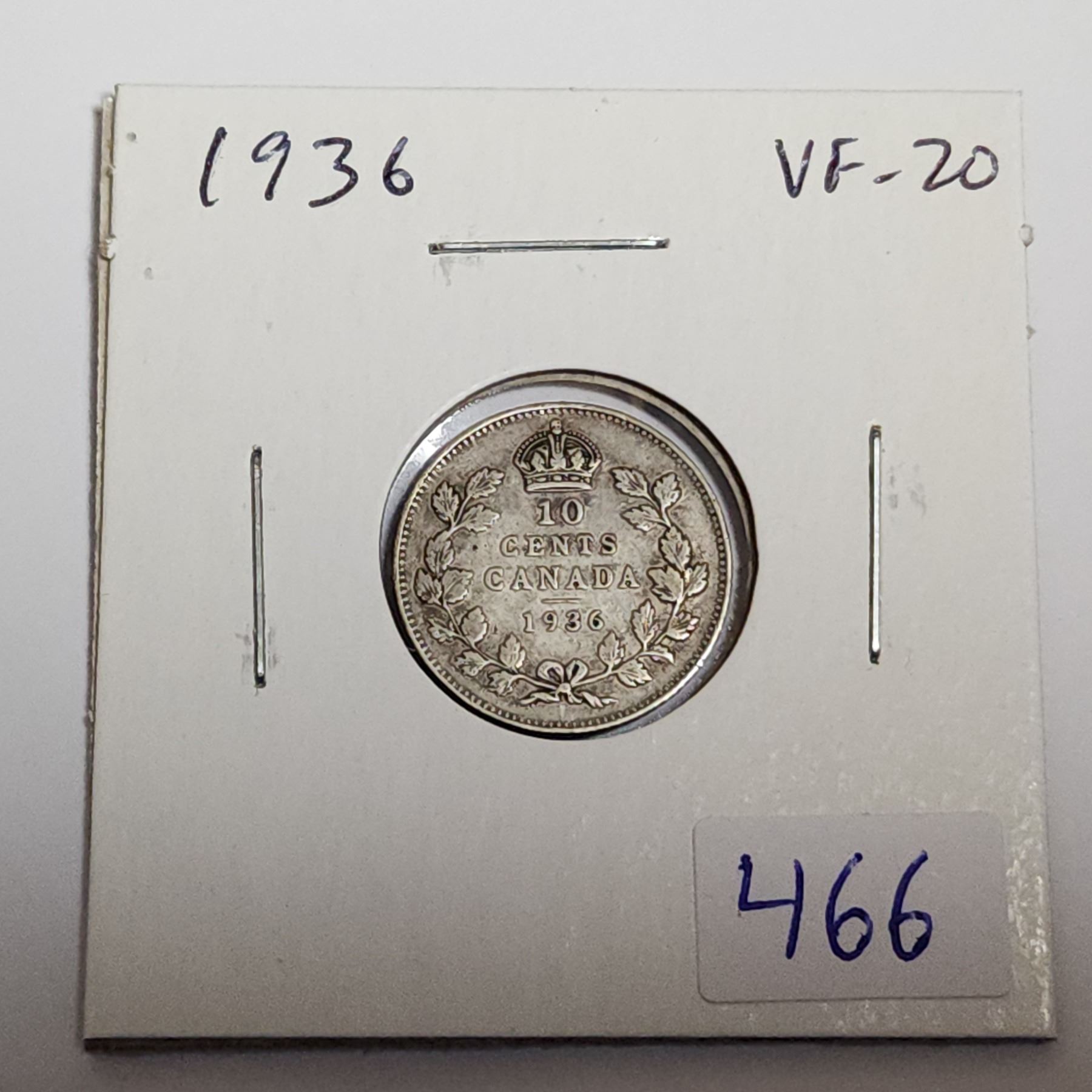 1936 Silver 10 Cents. Last issue of King George V. VF-20.