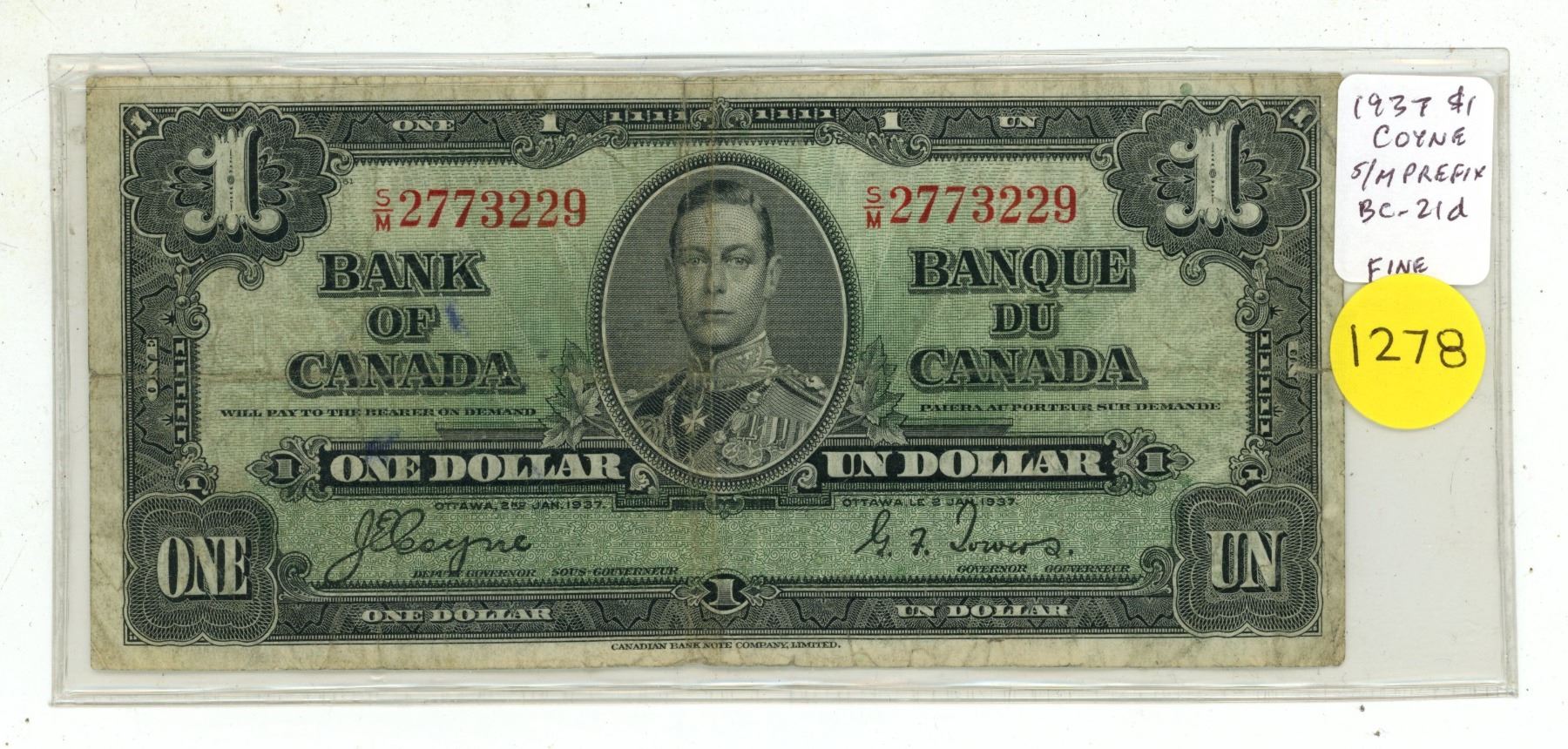 1937 $1 Bank of Canada. Coyne-Towers signatures. S/M Prefix. BC-21d. Fine.