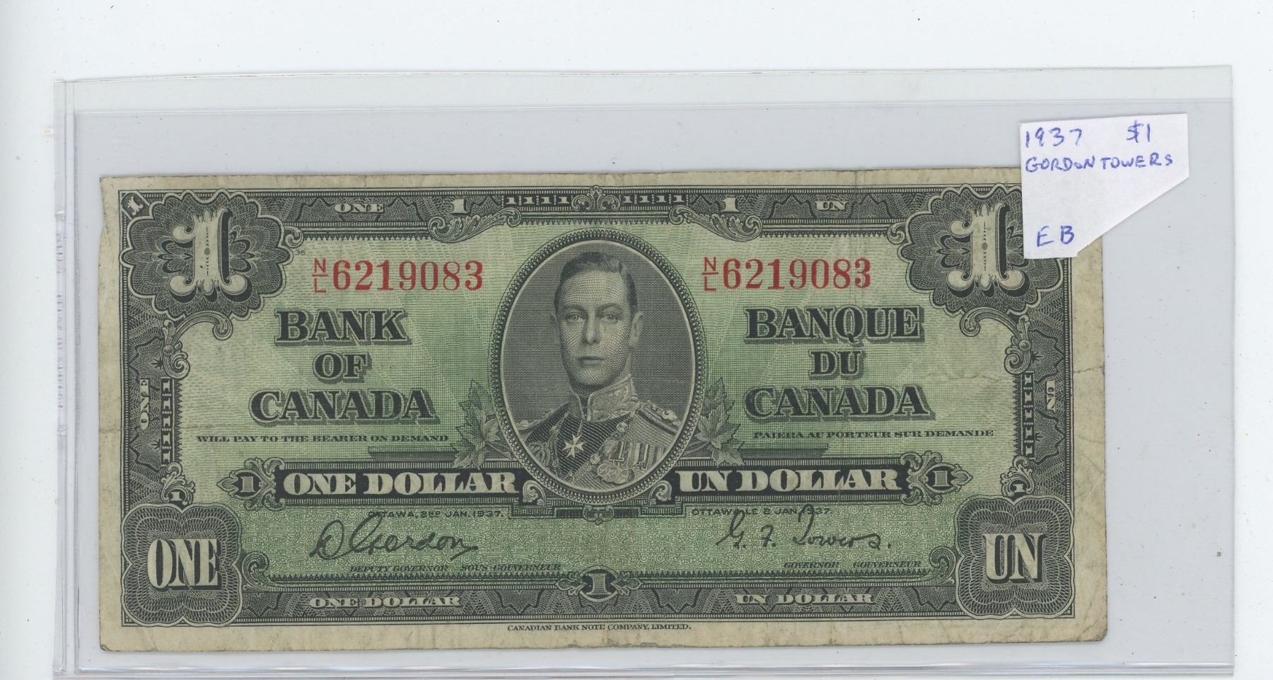 1937 $1. Gordon-Towers signatures. Wide Signature Panel. BC-21c. N/L prefix. F-12.