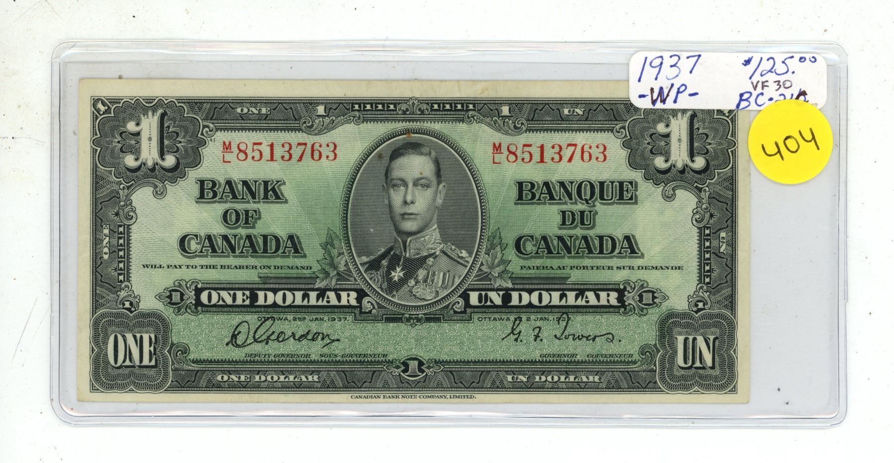 1937 $1. Gordon-Towers signatures. Wide Signature Panel. M/L Prefix. BC-21c. VF-30.