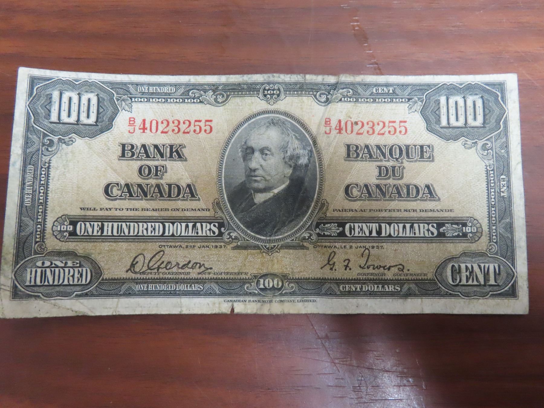 1937 $100 note of canada banknote macdonald B/J 4623255