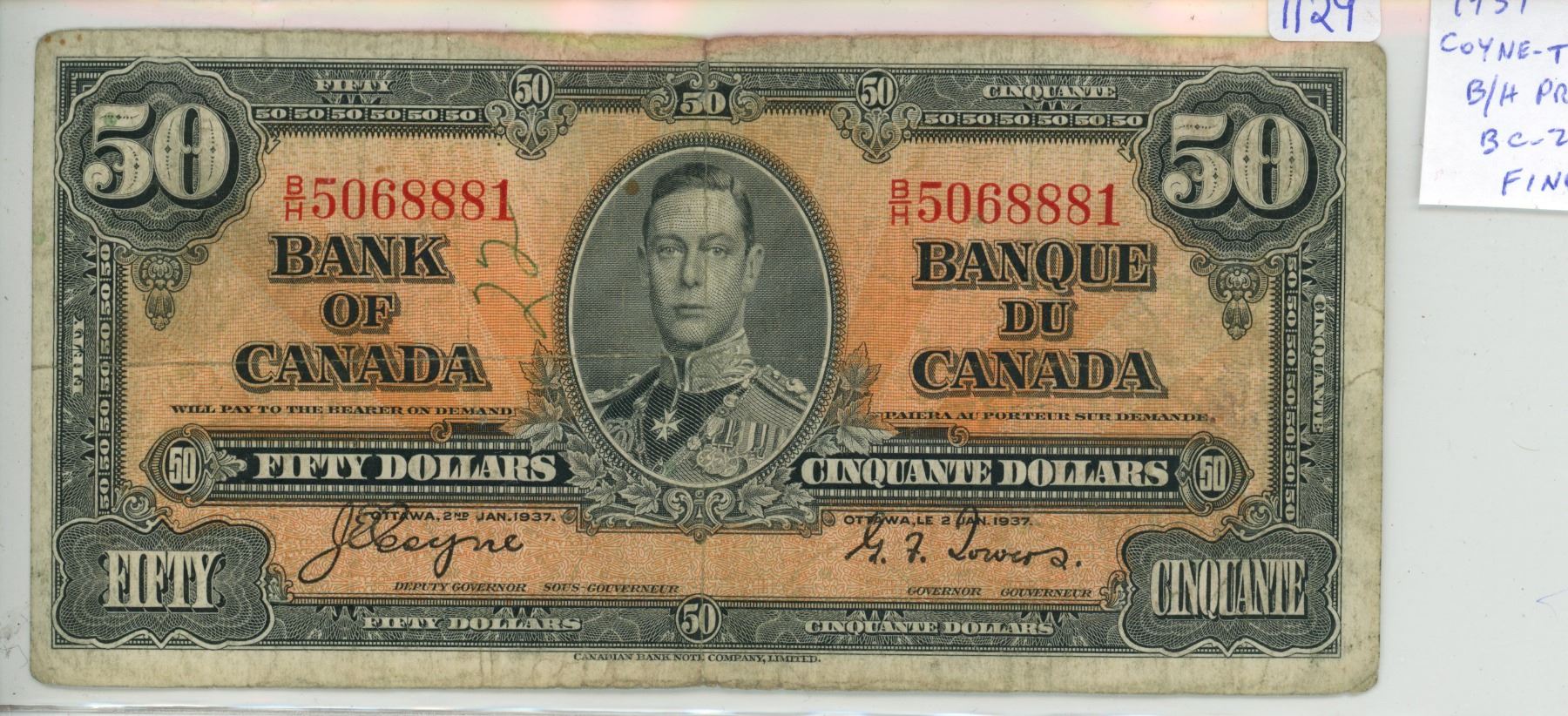 1937 $50. Coyne-Towers signatures. B/H Prefix. BC-26c. Fine-12 with 22 in ink.