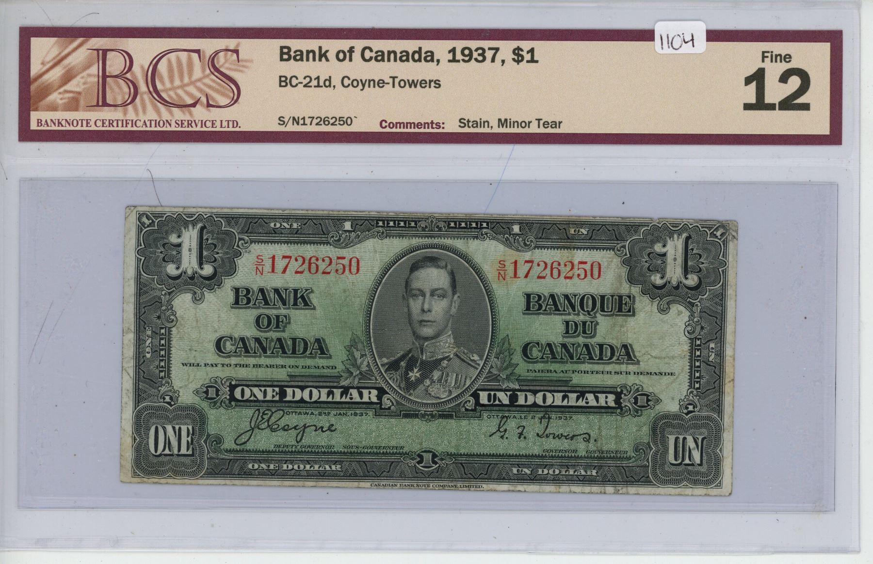 1937 BC-21d 1 dollar, Coyne-Towers, S/N1726250 F-12 Stain, Minor Tear