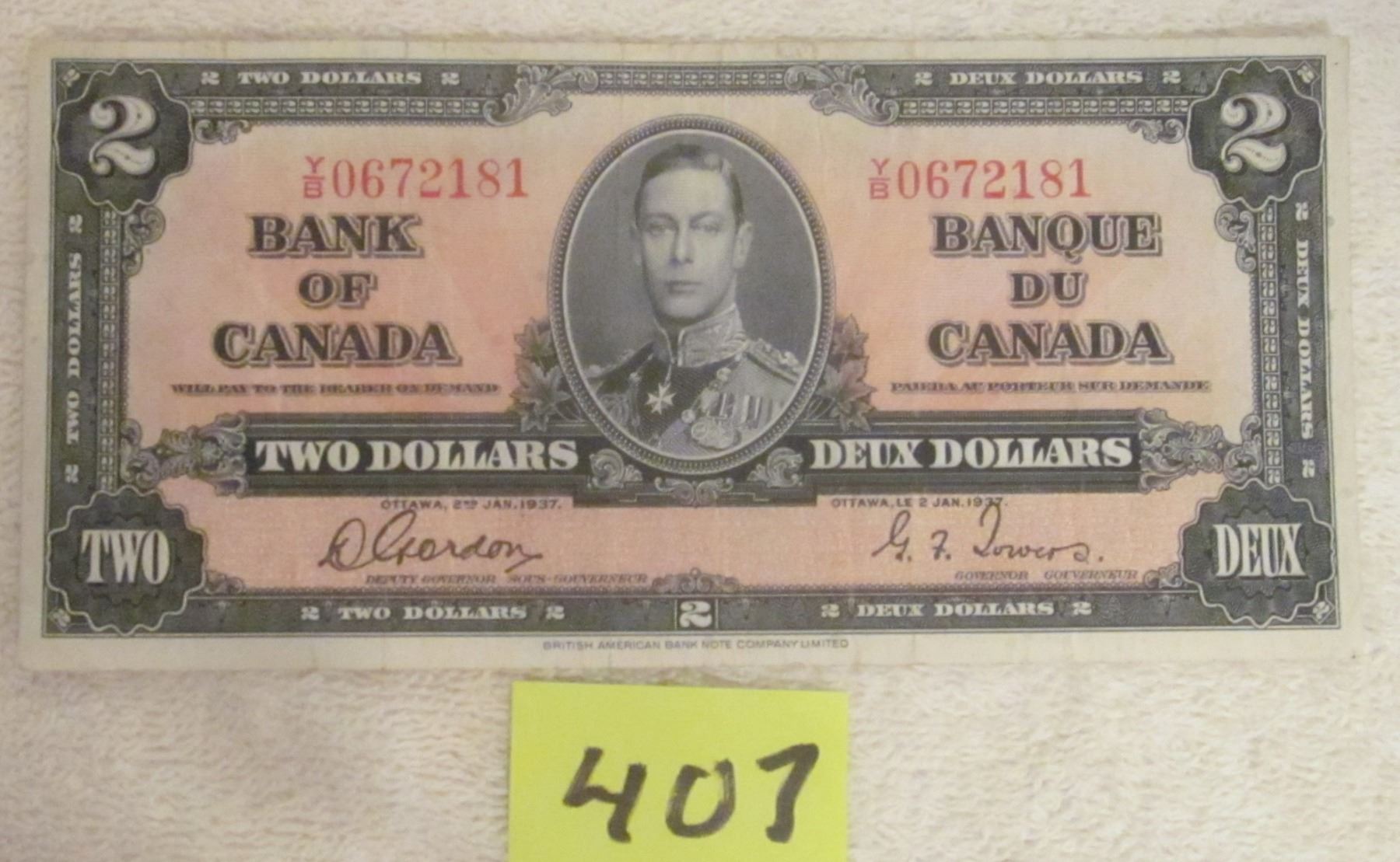 1937 Bank Canada $2 bill/banknote King George V Gordon-Towers YB0672181