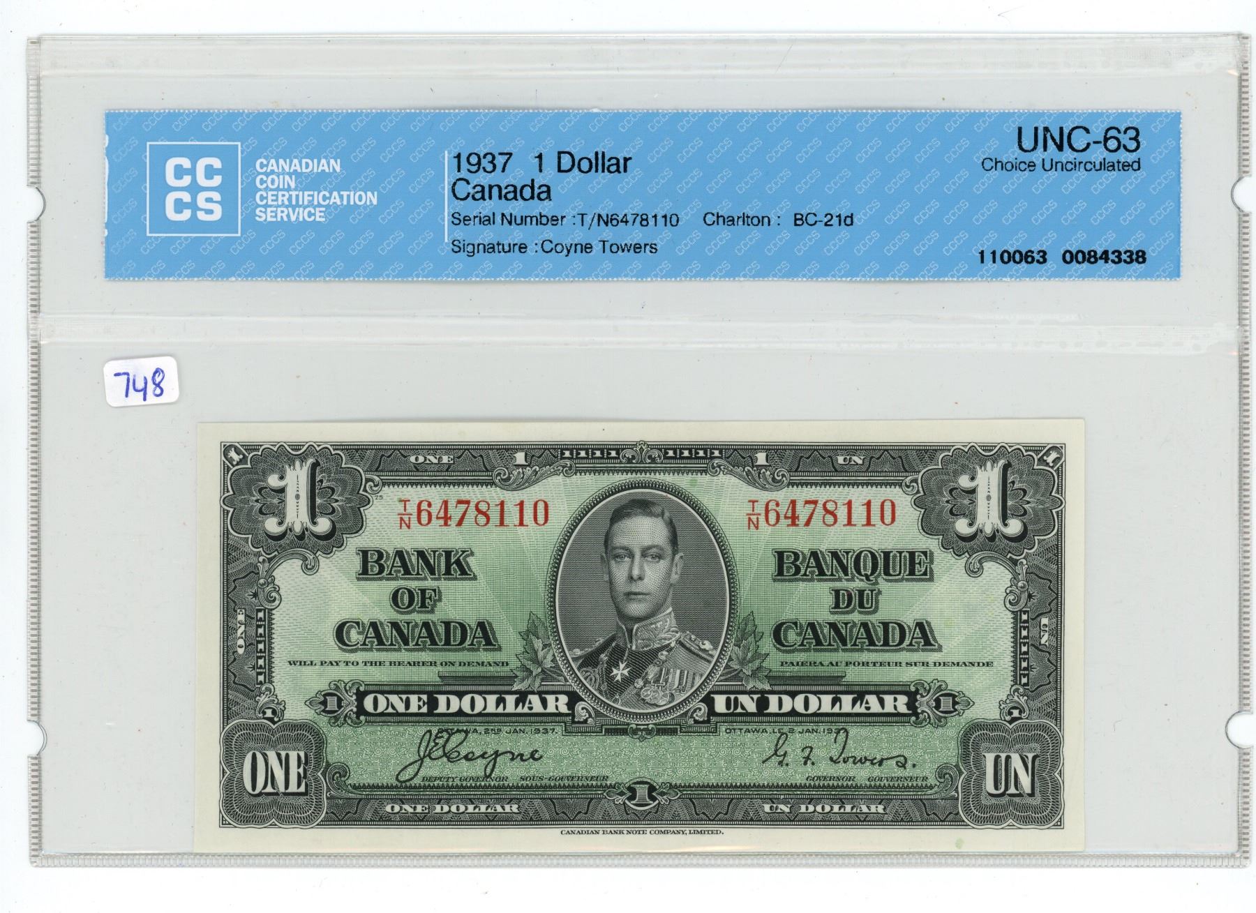 1937 Bank of Canada $1, CCCS Choice UNC-63, Coyne/Towers (#T/N 6478110)